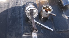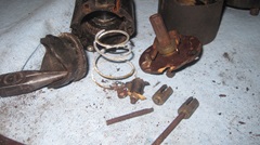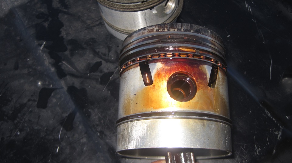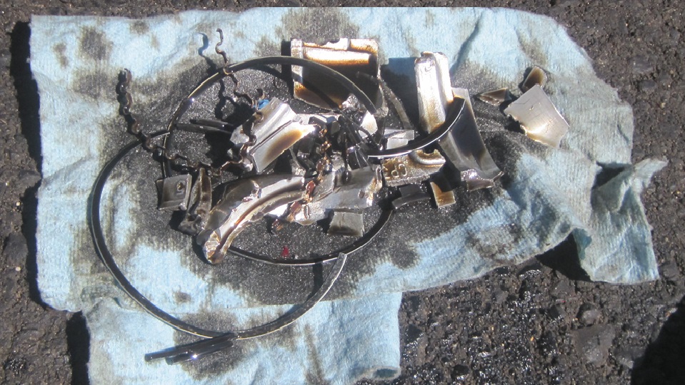 Here is the stuff we fished out of the sump. A few pieces of piston skirt, broken one-piece iron #5 oil wiper ring, broken 3-piece #4 oil wiper ring, no trace of the top three 1-piece compression rings. The piston crown down to and including the thick metal around the wrist pin seems to be in tact. Remember it was running well when we drove in, except for the knock. Oil consumption would be a result of the broken oil wiper rings, while the knock would be "piston slap" due to part of the skirt missing. We wouldn't want to drive it much farther with the broken piston skirt, at least not under power on #1. We did clean and reinstall the sump, filter, 4-quarts of fresh oil, and drove it back to the truck stop (with three spark plugs).