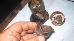 This one looked like it had been lying on its side in water for a long time. Two of the long screws were badly rusted and broke while trying to unscrew them. This left two if the rear wire terminal blocks useless with the broken screws inside. The leather seal cup was entirely disintegrated, which cannot be replaced without time consuming surgery, One of the electrical fixed contacts was broken away from the Phenolic plate, ruining the entire contact assembly. You might notice the wire connection blocks are hex shape rather than the more common square terminal blocks. so the rear of the housing has mating hex nests, so the rear housing and terminal blocks are not interchangeable with parts from another switch. There is another piston with a decent leather seal (below right), but we will save that for a different assembly. In the end, noting of switch #4 could be saved.