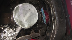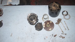 Next to open was #4, on left end of the line in first picture, because it was the dirtiest and might be the greatest challenge. The double-D threaded front mounting collar was also broken/missing, so the outer shell was trash regardless. Sure enough, the screws were stubborn, and one of the front three would turn but not unscrew. Apparently one of the small captive hex nuts inside was turning in the housing. So I( had at it with a hacksaw around the perimeter a half inch from the front, and proceeded to break up the outer shell for internal access. At least see how many parts we could save.
