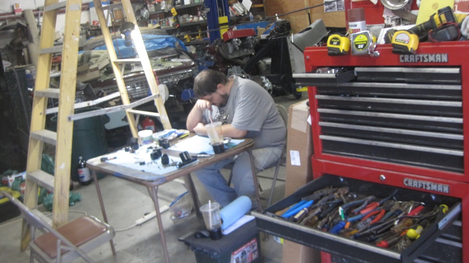 9;30am - Tracking says the package arrived this morning, one day late, but we can pick it up now. Car still running on three cylinders for a ew miles, pick up package with New Old Stock pistons, then around the block to the open parking lot in front of