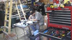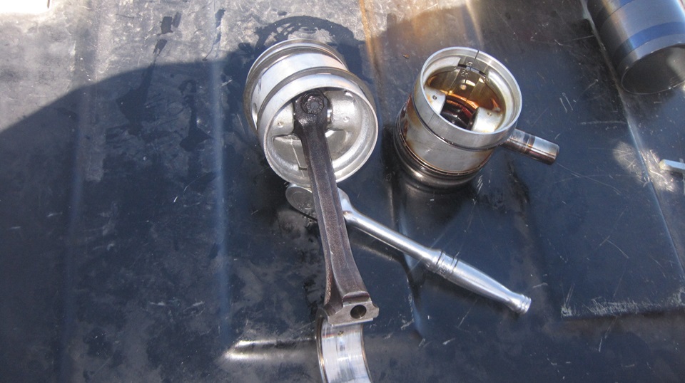 compression on #1. Kind of noisy and slow, but it runs okay on three. Mile and a half away, pick up the package with rod bearings at the P.O. Casual question, friendly advice, find a clean parking lot at the grocery store next to the Napa just around the block. Jack it up best we can, remove oil filter, drain oil, and proceed to remove the sump. We did remove the #1 rod bearing for inspection, nothing wrong there, but install a new one and keep the old one with the new set. -- Looking farther up, we found #1 piston is broken. Oops. BTDT, getting more PO'd about repeated broken cast aluminum pistons. Been thinking for many years that I would like to have forged pistons, but it has never been convenient. Maybe now would be a good time to make it happen.