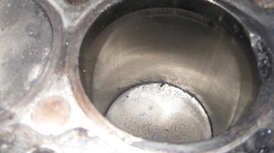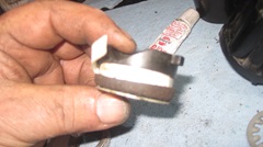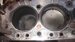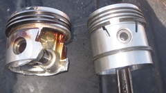 We knew from Monday's inspection that #1 piston had the broken skirt and missing oil wiper rings (reason for the knock). Now navigator was the first to notice #3 piston had a mottled top and small kerfs around the edges. Good spotting, he's getting good at this stuff. This implies there may be a broken compression ring allowing compression gasses to blow past the top corner of the piston. Yup, spot on, #3 was missing most of the top ring, again lucky it didn't scratch the cylinder wall. Final count is two junk pistons,and two others good enough to save as spares.