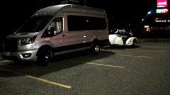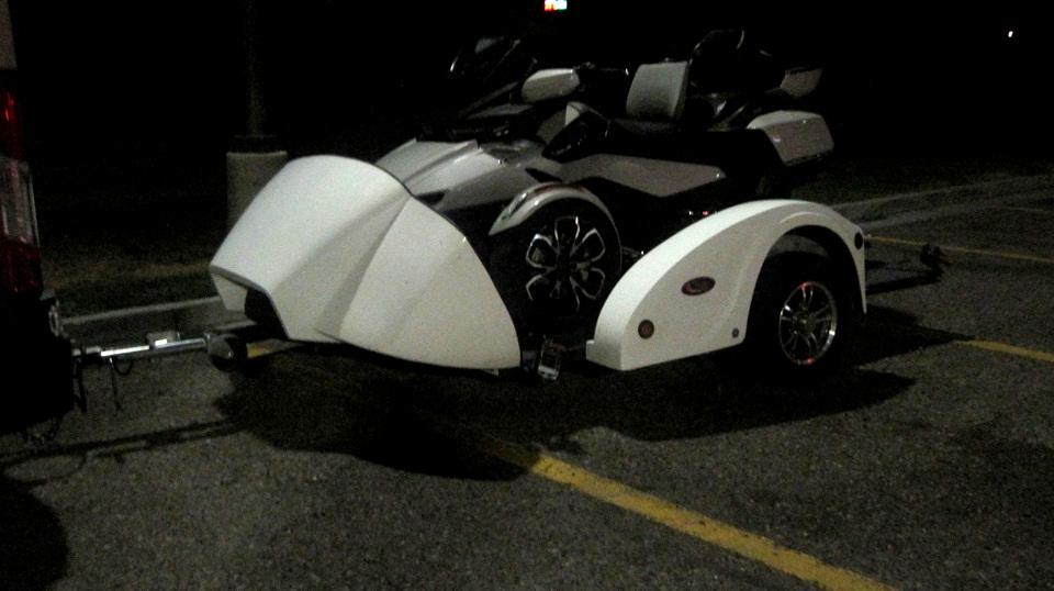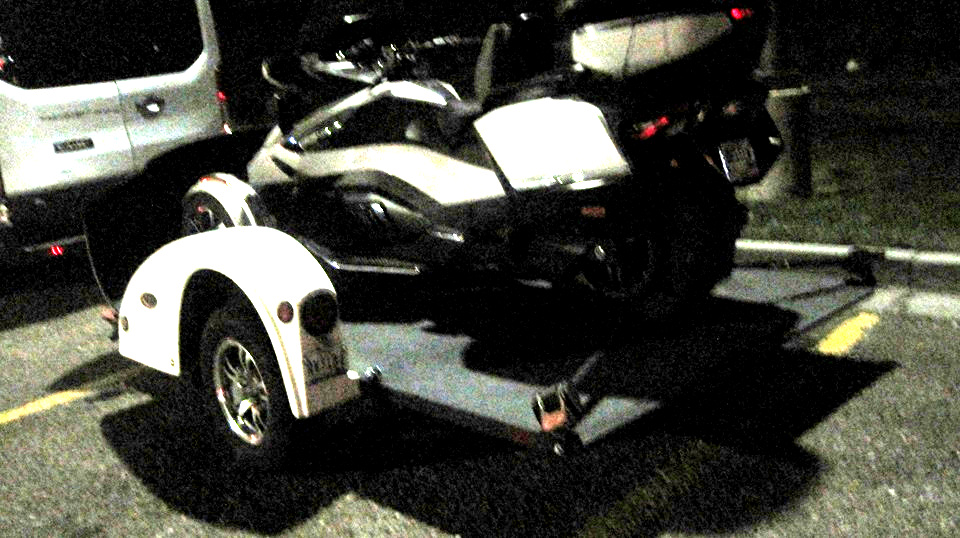 Saw this in the dark a minute after midnight. At first I thought it might be some vintage British sports car converted to a luggage trailer, but no. Turned out to be a modern large 3-wheel touring motorcycle on a matching flat bed trailer.