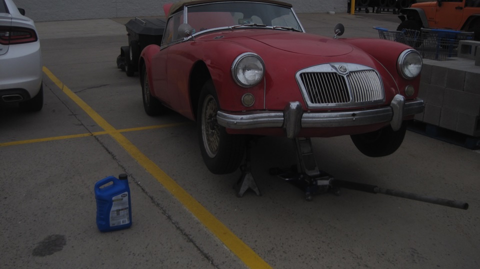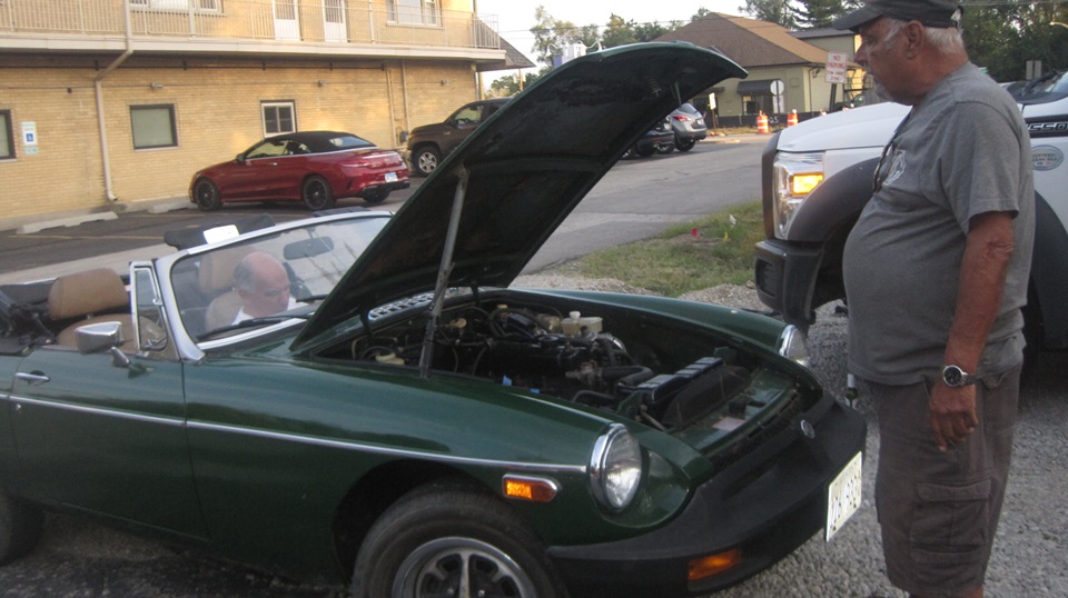 Dropped by Darrell's garage at 10-am. The orange MGB was getting fine tuning, setting ignition dwell and timing and idle speed. Running well, another car ready for the weekend car show. A short side trip to restock engine oil in the boot before heading for lunch.
