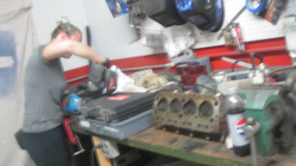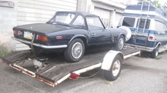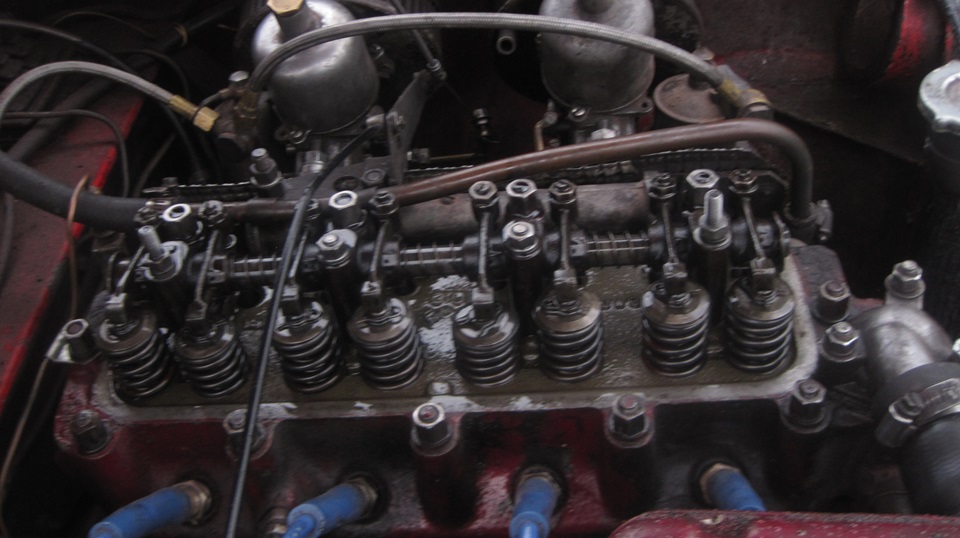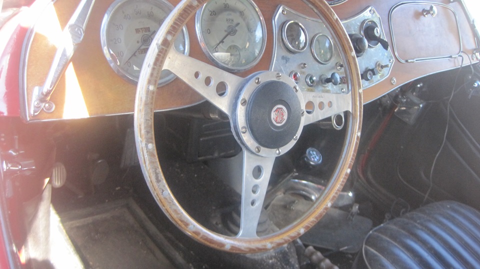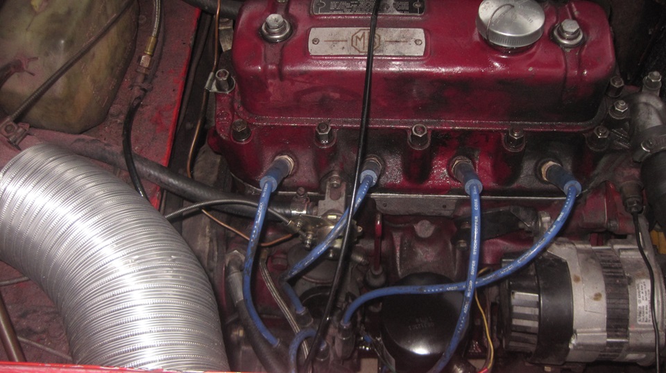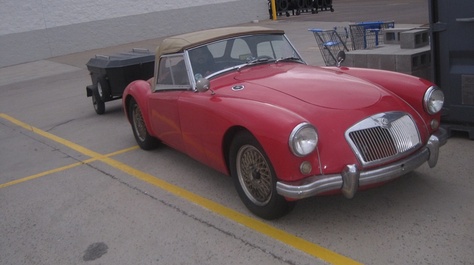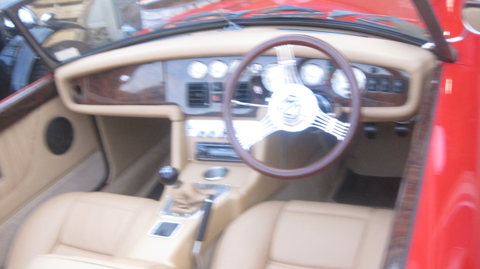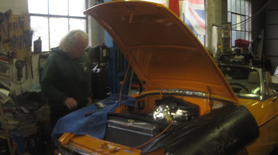 In the side bay someone polishing rust from a MGB rear bumper, next to the MGB cylinder head, and an MGB 5-main bearing engine nearing completion of reassembly, ready for the cylinder head. Outside there was a rubber bumper MGB with a Weber downdraft carburetor running a little rough with a rather loud whistle. That turned out tobe a vacuum leak under the carburetor mounting gasket, soon fixed by tightening the mounting nuts. That car also had a variety of nice wood trim parts inside.