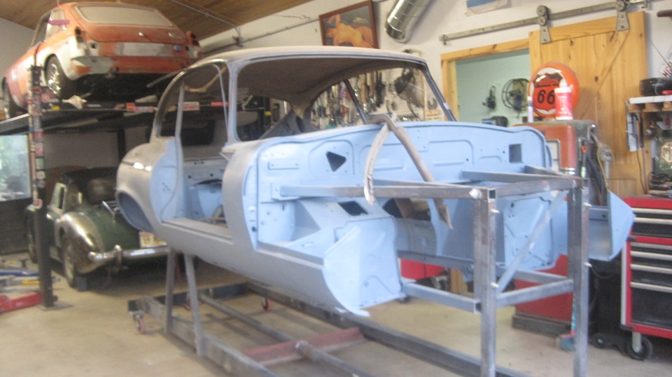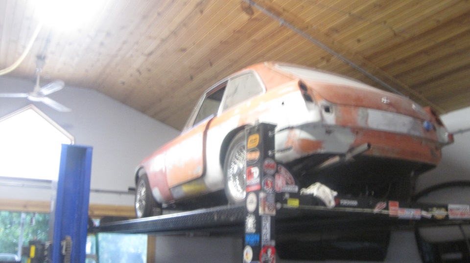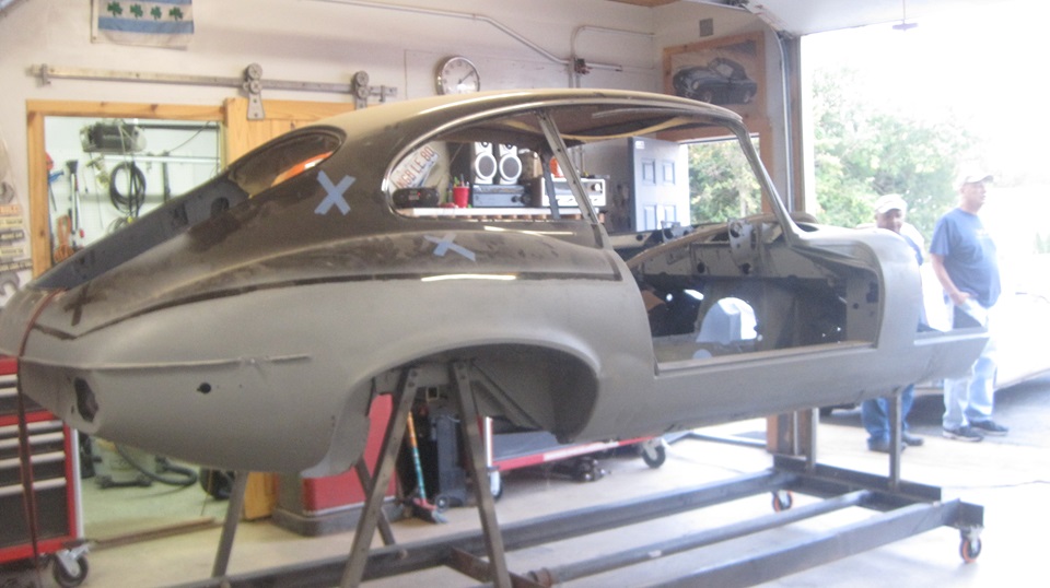 A quick peek inside has the CMGC club project car MGB GT high on a lift, mostly complete but still no primer paint. Something new this time is Tommy's next project, a Jaguar E-Type Coupe with some markings on the roof, about to be cut down to be transformed to convertible.