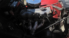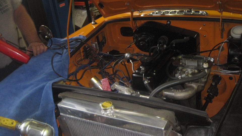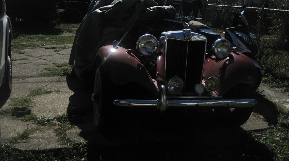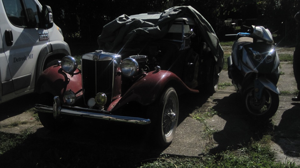 Bail out of Hanna, IN by 9-am. Promptly hit a construction road closure and detour, killing half an hour. Then another time zone change from Central to Eastern time crossing from Indiana to Michigan. Shortly thereafter, sputter on three cylinders at speed under heavy throttle, not out of gas, but must be points closing up again. Last time we looked at the distributor was back in Laramie, Wyoming, what, close to 1500 miles? Time for a breakfast break in Hartford, Michigan, adjust points and timing, top up fuel, and get back on the road. -- Oops, the sputter got worse, maybe a condenser going bad? Another quick stop at roadside to pull the test condenser out of the tool box, clamp it to ground on the alternator bracket and plug it to the distributor side of the coil. Unfortunately no difference, so not the problem or cure, but we have an appointment, so carry on, sputter, sputter, but generally keeping up with traffic. -- Just after 3-pm we arrive at appointment with a fellow named Earl on a side street in Lincoln Park, Michigan. We were here to inspect an MG TD for sale on Craigslist on behalf of a prospective buyer in Connecticut. Business first, will worry about our ignition problem later. -- Got the keys, remove cover from the TD, walk around start taking pictures.