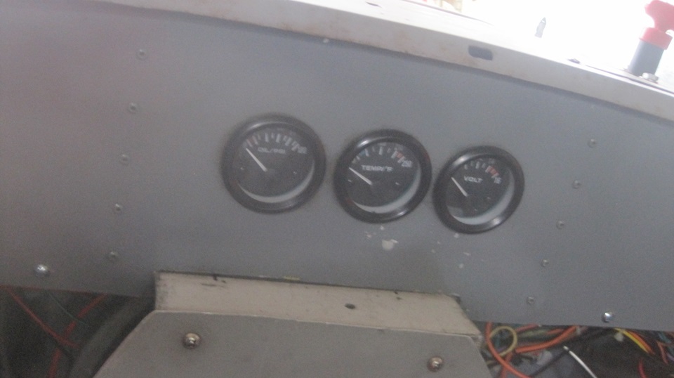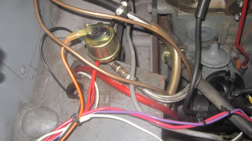 I helped with some head scratching to figure out how to attach it securely so it won't fall apart again. Short on time today, so we expect to get back to this issue tomorrow. There was some poking around with wiring behind the dash trying to get a new LED digital and analog oil pressure gauge to work. We think the second new electrical sender unit is faulty right out of the box, so put this off another day as well. Now Jerry has a shopping list for tomorrow morning.