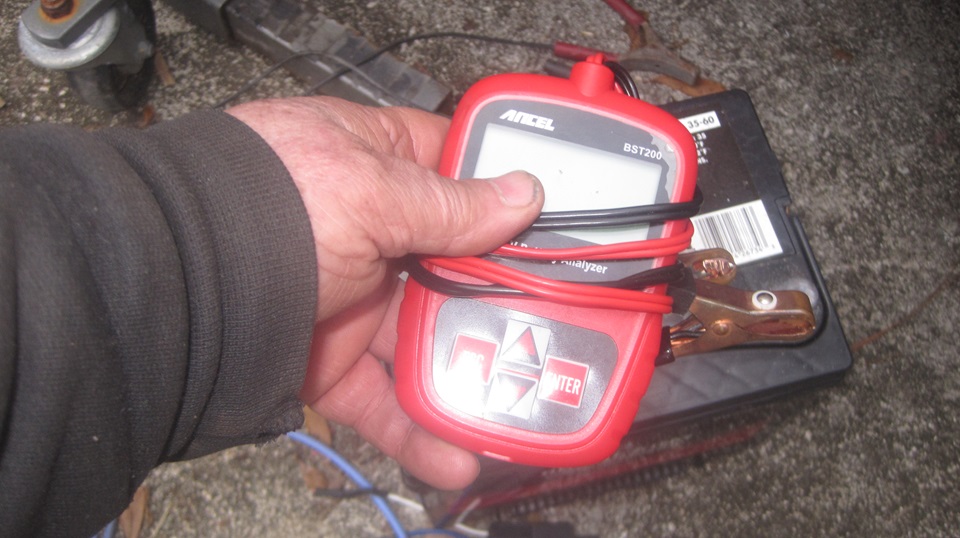 been on the charger over night, set on" 25 amp boost". Supposed to be an automatic shut-off charger, but looks like it didn't (hut off). the battery was hot, and was gas off-gassing visible vapor which of course smelled like battery acid, not good, apparently boiling water out of the battery. Unplug the charger before disconnecting the charger clamps. Using the same small battery tester, the apparently cooked old battery showed capable of nearly 500 amps cranking capacity, like it might be a slightly used battery in pretty good serviceable condition. Say what? Seems weird. Set it aside to cool and maybe test it again later to see if it might regress.