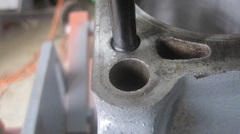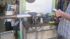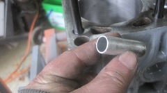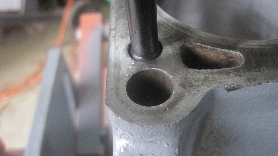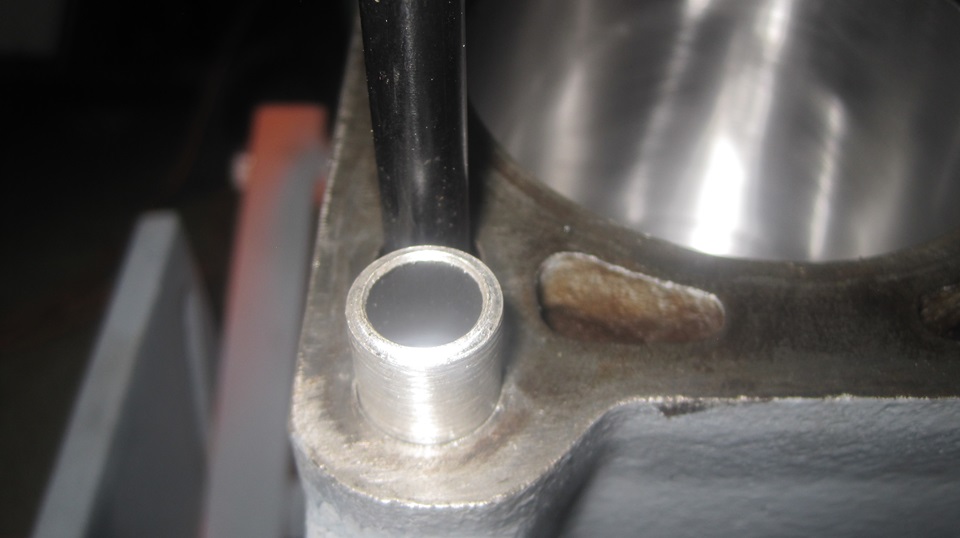 At the front and rear corners of the head and block there are two holes where oil can drain down from the head to return to the sump. no bolts here, but the holes are slightly counterbored to leave a narrow step in the bore, about an inch and a half into the block and about an inch into the head. Don't know the original intention, but these holes look ideal to accept a tubular alignment pin. Someone brought in a piece of aluminum tubing about the right size. Seems like it should want steel tube, but soft aluminum will do for now. The hole at rear of block would just accept the tubing, while the hole at front was a tad smaller and wouldn't fit. Both holes in the head were the same smaller bore as well. Simple solution, chuck a piece of the tube in the drill press to spin it while filing down the OD a bit to fit into the holes, polish it with sand paper, and cut it to appropriate length. A bit of a fiddle, but didn't take long.