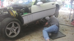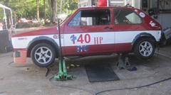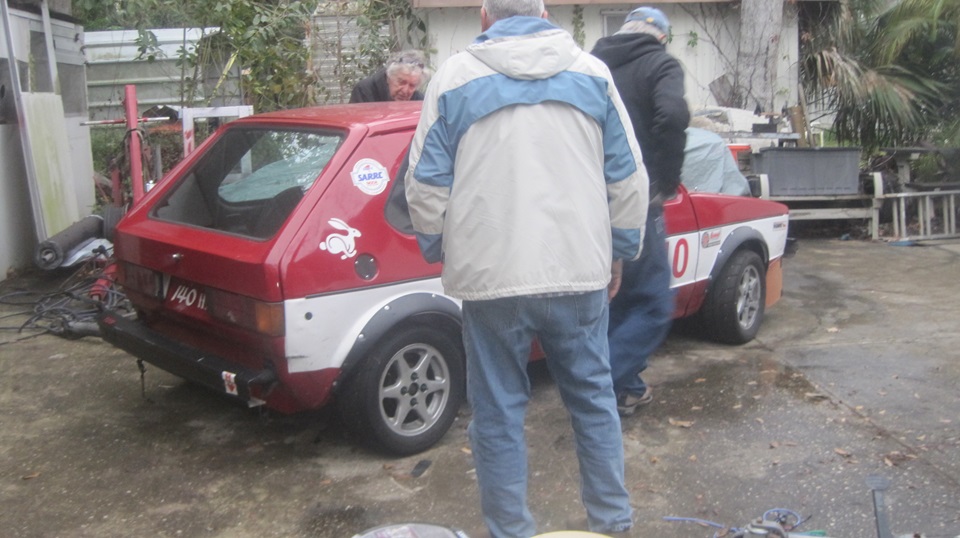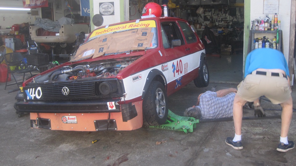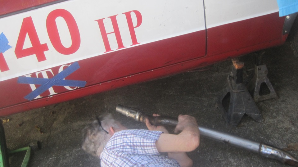 After lunch we began to get serious with the racing Rabbit. This one needs to be on the trailer by next Friday to go racing again. In two o0f the last four trips around the track part of the exhaust system had dropped loose to drag on the pavement, causing the car to be black flagged, screwing up a good race week end. It could have been worse. If the parts fall on on the track they might finish the race, but then they get billed for the service vehicle to make a lap to pick up the parts.