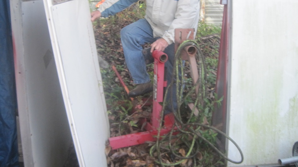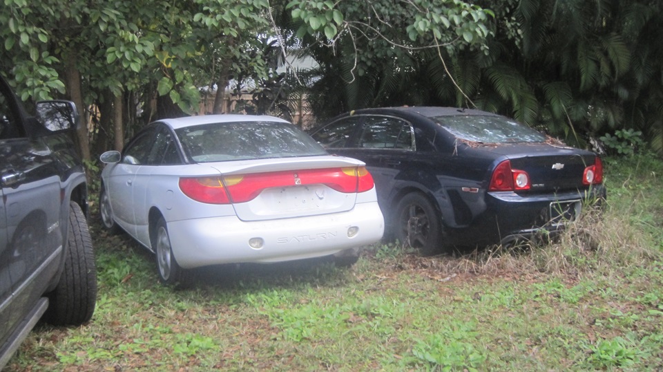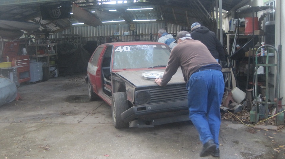 The white Saturn was long time sitting in front of the paint booth,lost title, now likely to be junked, so push that to other side of the complex and stow it under some trees. The "other" racing Rabbit had been sitting in the paint booth and had to get out. Well, you know how rabbits are, never just one. This one is now pushed under the large car port where Tina has been during work for the past few years. Story on this dusty Rabbit is that it is a very fast race car that had the front and damaged and front clip removed for repairs, new bonnet and front wings already in hand, likely next in line for reassembly.