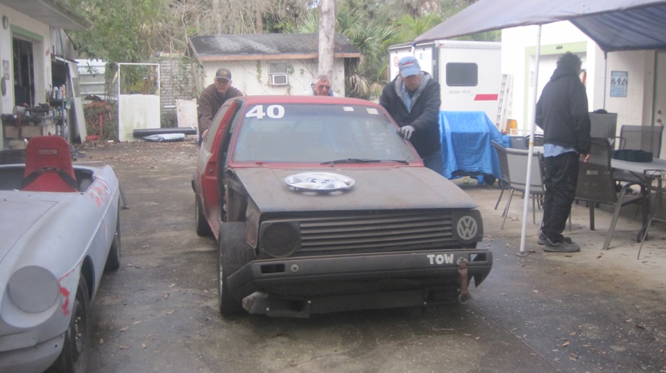 Cold again,like 40dF early morning, but warming up near 45dF by 10-am, and it was tech Friday at Tech Central, so were determined to go. It was time to get Tina the wannabe race car into the paint boot, which was significantly cluttered because it hadn't been used for a few years. Time for some musical chairs. The racing Rabbit was sitting in front of the shop, so clear space in the lift bay, raise the Sirocco high, and push the Rabbit underneath. One engine stand and the engine hoist also in the way, so shove those off to far side of the paint booth. Spend some time realigning three sliding doors, and relocating stuff inside either outside or into the corners.