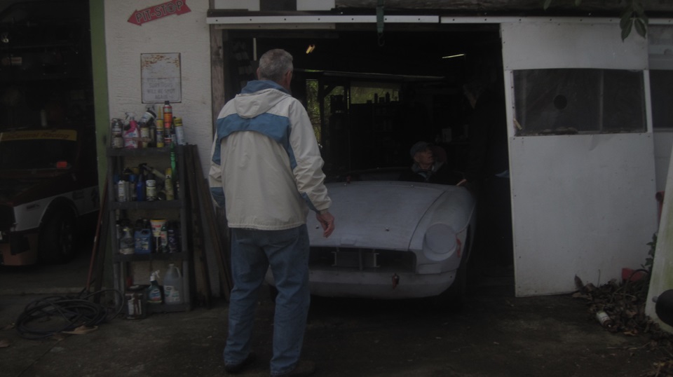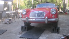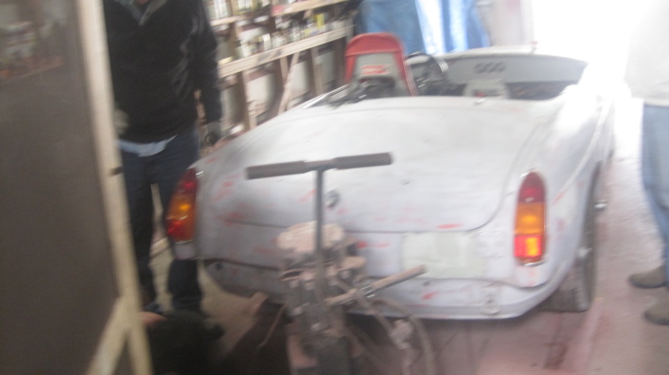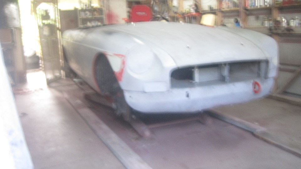 Finally got the paint booth cleared, sweep out the leaves and blow out the dust. Fetch the now running Tina, and back it carefully into the paint booth. The hydraulic floor hoist is portable, so center that in the work space,and place a few boards along the sides to raise the MGB race tires enough for the low hanging exhaust system to clear the hoist.