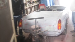 Parked in final position, close the front doors to keep the wind out. Find some 4x4's, 2x4's, 1x4's, cut some to 6-inch lengths for stacking and shimming between lift and car floor. Finally it was lifted a bit with wheels removed. The hoist will be very handy for variable height when painting. Remove tail lights and a few remaining trim pieces, give it a pat and call it a day. Considering the current cold weather, looks like painting might be next week end.