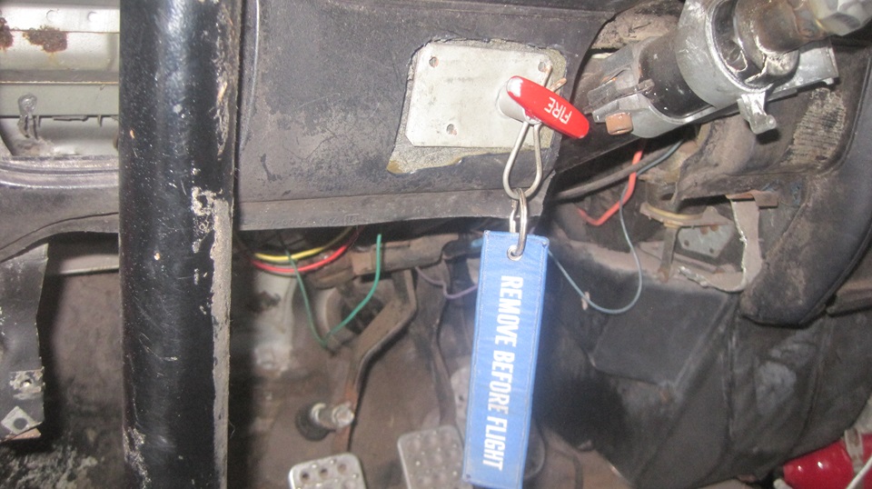 Drill a hole in the dash, put the small panel in front, cable through the hole,securing nut in back. Route the pull cable under the dash, put the Halon bottle on floor at right, connect cable to pull lever on bottle, drill holes in floor for mounting bolts, and a hole through the firewall for the Halon output tube. Still needing a bolt for the spray nozzle bracket in the engine bay. Amazing how these 15 minute jobs can often take at least three hours.