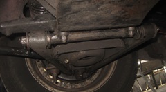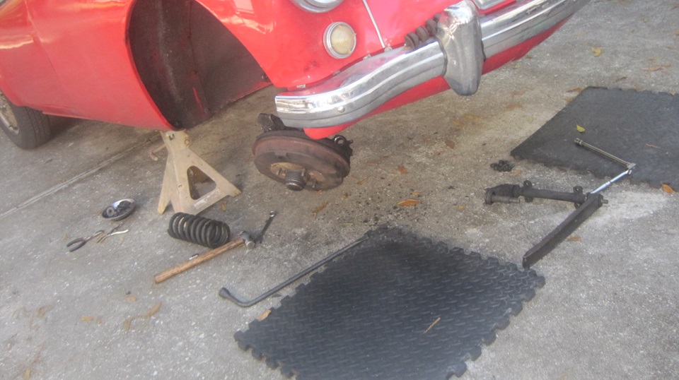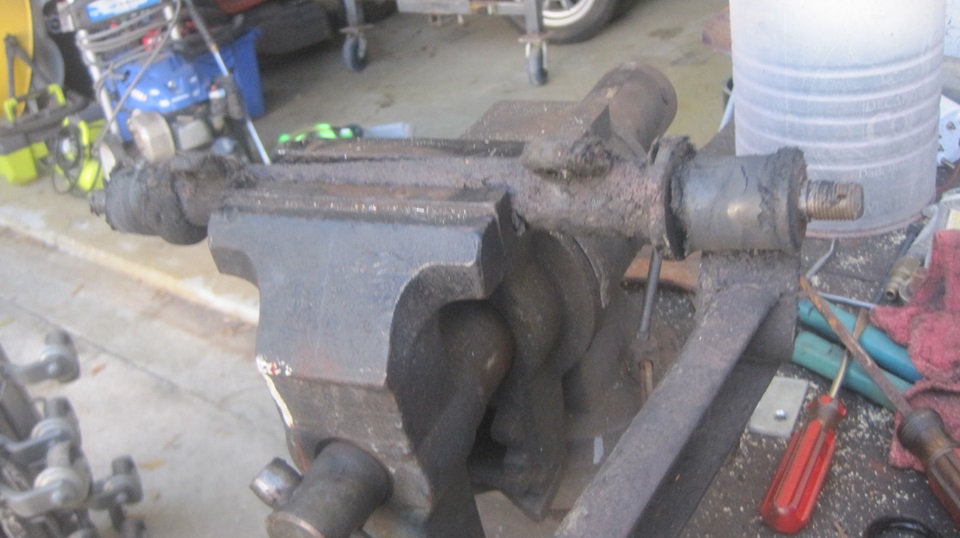 Back to finish the job today, working on the left front suspension this time. Loosen lug nuts, jack up, place stands under side frame, remove wheel, place jack under coil spring, and lift the spring pan to get the shock arm free of the rubber frame bumper. Loosen spring pan bolts and remove lower trunnion bolt. Lower spring pan and push down to remove coil spring, then remove spring pan bolts. Like on the other side, the lower A-arm inboard pivot bushings (MGB GT V8 style) were rusted onto the pivot shaft (after 30 years in service). So needing to remove four bolts to separate the pivot shaft from the frame. Then take the assembly to the vice, muscle the side brackets off of the rubber bushings, use knife to cut away the rubber on one side, grind through the steel tube with a thin abrasive wheel in a Dremel tool. Hammer and chisel made short work of opening the tube a until it would rotate the bushing tube a bit, then pull it off with a big pliers.