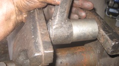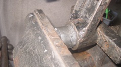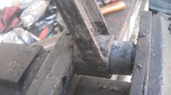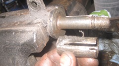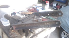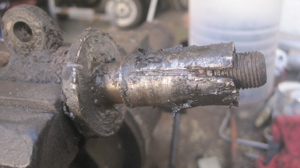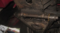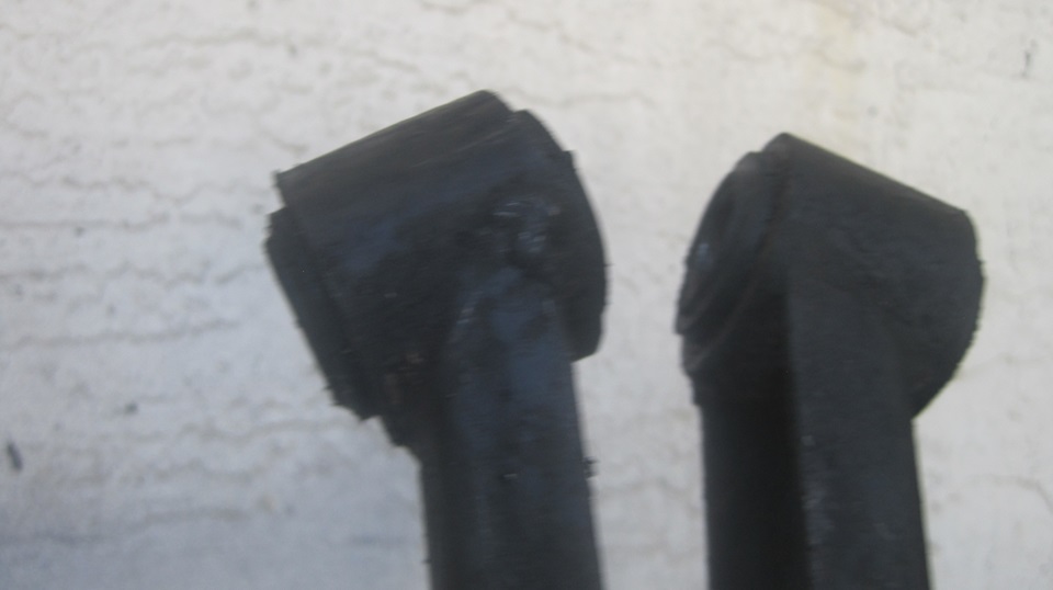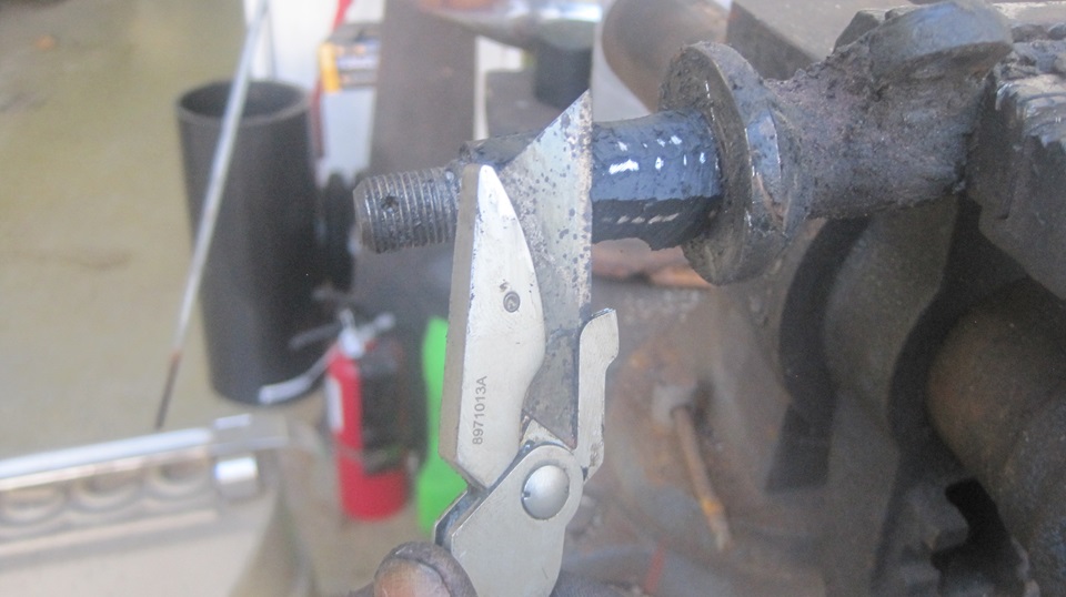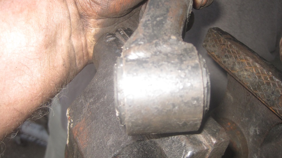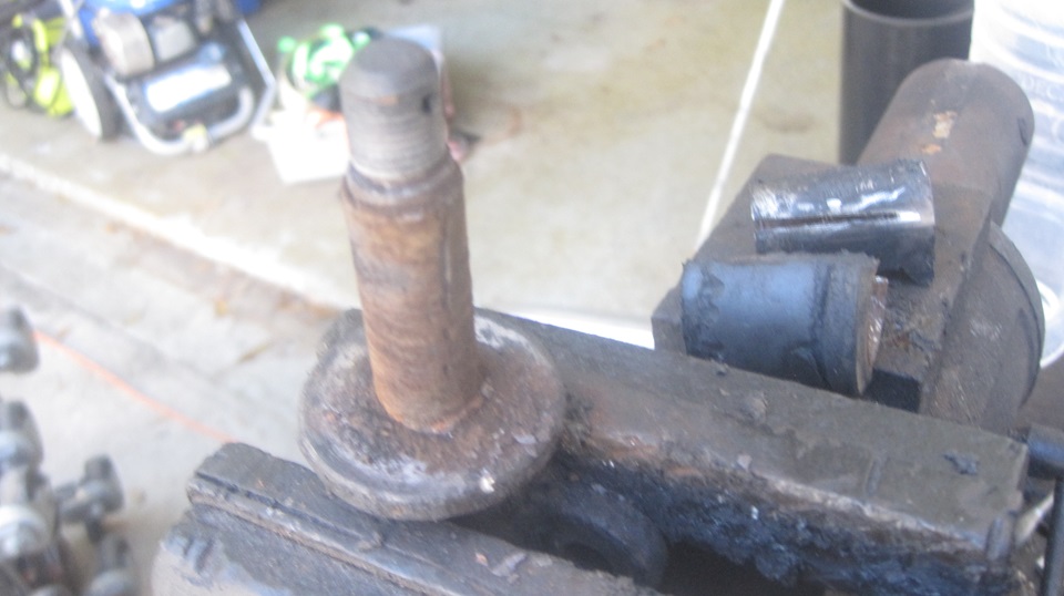 One problem, We could not get the 30-year old MGB-V8 type bushings with inner steel sleeves to release from the pivot shafts. Someone warned us bout this several years ago. they either rust in place, or the steel tube ends may be mushroomed inward to to key onto the shaft. So remove four bolts to separate the pivot shaft from the frame, and take the pivot shaft and side arm assembly to the bench vice. With the bushings being rubber, it wasn't too much effort to pull and twist the arms to get them separated from the bushings. Cut away the rubber to expose the steel tube inside. Grind a narrow slit down one side of the steel tube to the root diameter. Then use chisel and hammer to split the tube and get it to rotate a bit. Then penetrating oil and large pliers would rotate the tube to get it off. That cleaned up okay. The small grinding kerf in the axle doesn't matter, as we re going to install the same type rubber bushings with inner steel tube. repeat both ends.