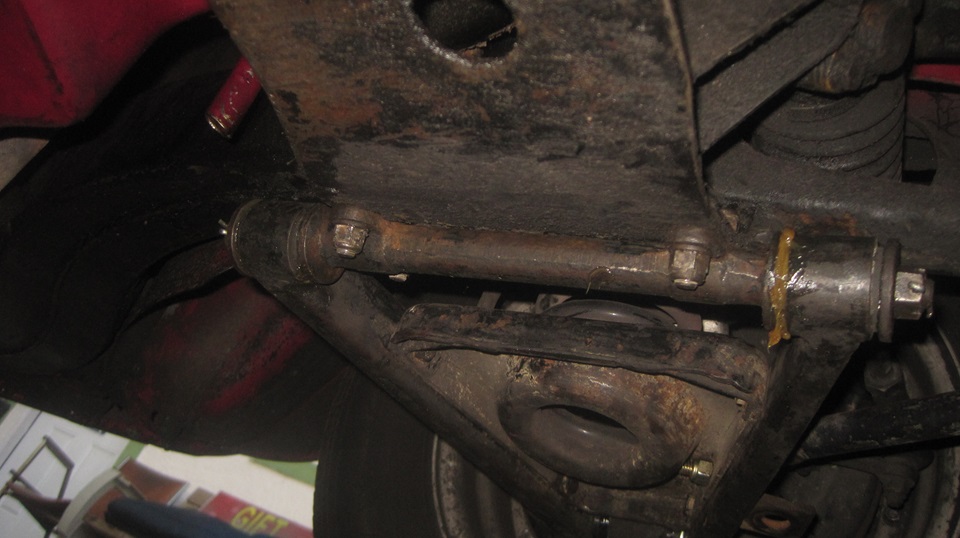 Something we have had on hold for a couple years as we had been fighting engine problems, but that seems to be solved now. Open day and very nice working weather, so it was a good opportunity to change out the bushings on lower A-arm inboard pivot points. These are MGB GT V8 type rubber bushings with steel tube inside. They have been in faithful service for 30 years, 480,000 miles. Very happy with that, but they finally seem to have moved a little off center, and maybe deteriorated a bit, causing some occasional clunk in the front suspension. So jack up the front, place stands under side frame aft of the front wheels, and remove the front wheels. Loosen all bolts in the front suspension, except for the shock absorbers.Remove the sway bar links. Jack under the A-arm, directly under the coil spring to lift the shock absorber arm just free of the rubber frame buffer. Remove lower trunnion pivot bolt, lower the jack to drop the a-arm, push the arm down to remove the coil spring. Remove the rest of the bolts to disassemble the spring pan and lower arms.