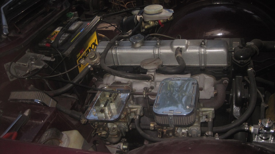There was a late model MGB with another Weber downdraft carburetor. This one running really bad, kind of surprised it was driven here. Lot of attempts to set the timing, not going well, too much spark advance and idling way too fast. I finally disconnect the vacuum hose from the distributor, and it promptly slowed dow,nearly died. Oh, okay, wrong vacuum source.