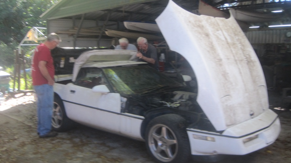 One slightly vintage Corvette with corroded and leaking brake pipe. The anti-lock braking pump and valve body is in a deep well behind the driver's seat. Access to the faulty pipe is only from underneath. The guys were talking about possibly removing the whole pump and valve assembly for better access to the brake lines. Boo, hiss, glad I don't own that car? By end of day it was covered up again, maybe next week.