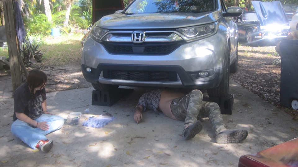 Jerry's daughter showed up with her Honda again. This is the one that was here for an oil change a week or two back, when we were complaining about the Jiffy Lube that changed the oil twice and managed to loose most of the screws holding the air pan underneath. By now the pan had broken loose and was dragging on the road, so time to install the new fastener kit with Tinnerman fasteners and new bolts. Plenty of time for more cursing at the Jiffy Lube crew for screwing up and causing all this bother to fix the car after their mistakes.