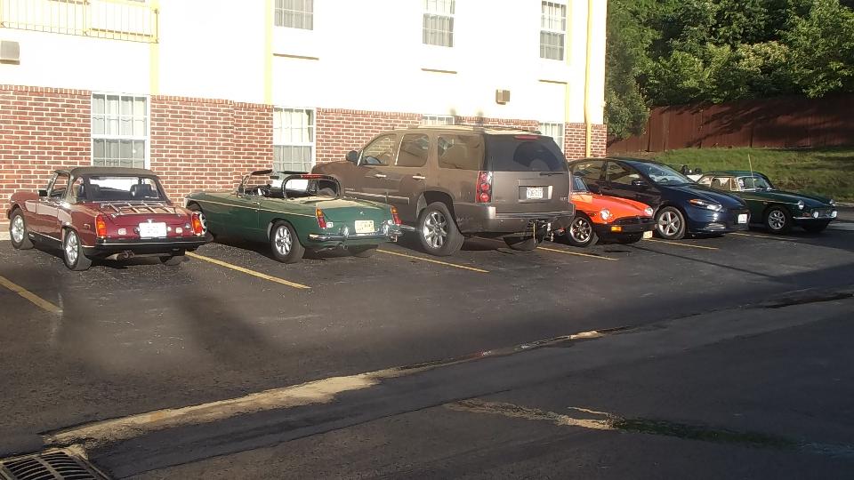 This was followed by an orientation meeting (introduction to the week's activities) including a bit of live entertainment. Shortly later we were off to the hospitality suite for the most important socializing with other MGA enthusiasts, some old friends and some new friends. One bit of disappointing news was that Scott and Mary Davidson from Ensinitas CA had flown in after their MGA had left them stranded and was towed twice only a short distance into their trip (first the SU fuel pump, then perhaps a failed Pertronics ignition module). Looking forward to midnight tire kicking tech sessions in the car park, but not to be as it was raining again, so just turn in for the night.