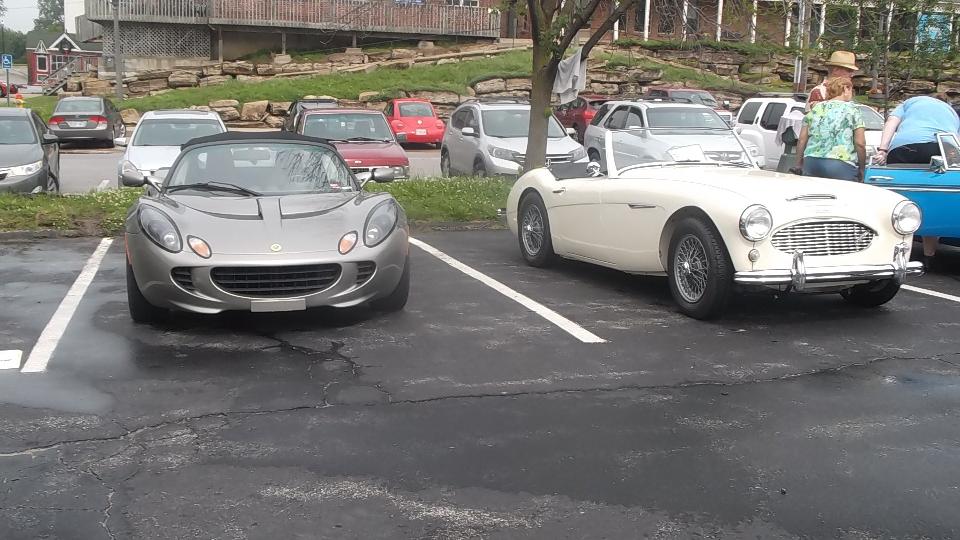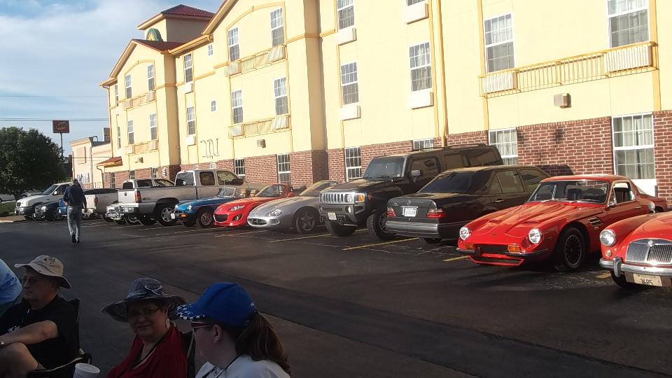 After the entertainment, a short time in air conditioning for photo processing, and a Walmart visit for a load of engine oil (upcoming oil change) and a DC to AC adapter (so we can get back to charging the computers in the car). Then down the road a few hours to Independence MO, east side of Kansas City), ready to run to St Louis next day. Then back on WiFi again to post the photos and notes on line, and send some photos back to the Healey club for their use.
