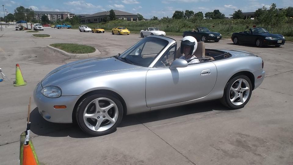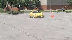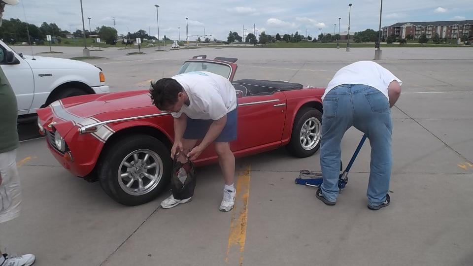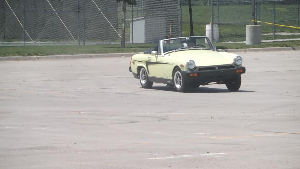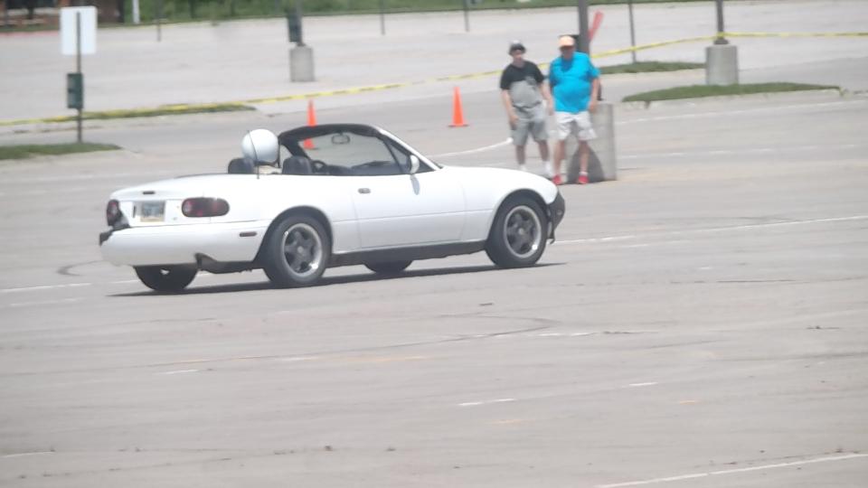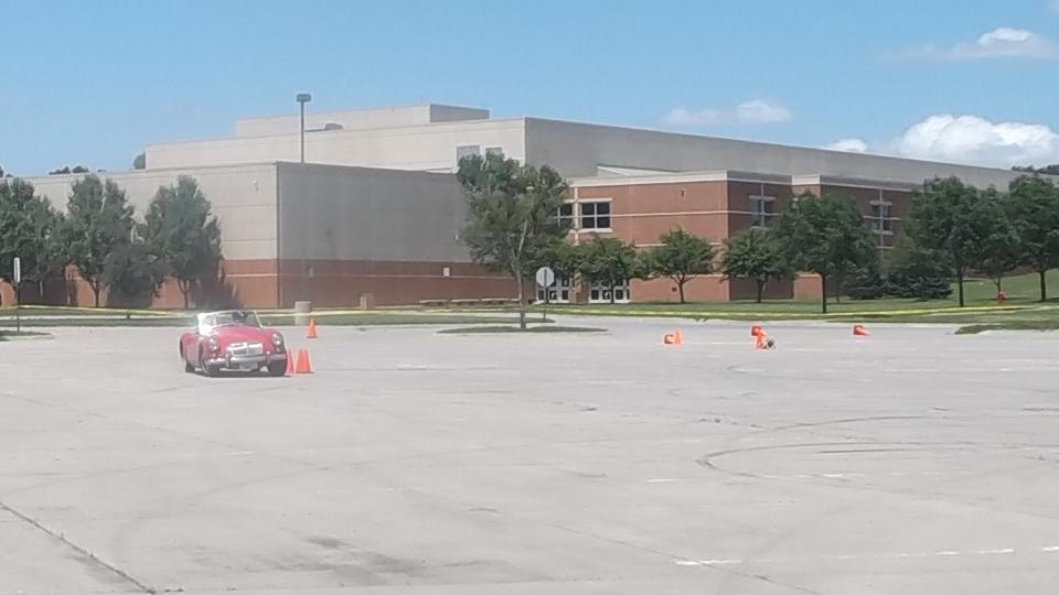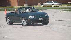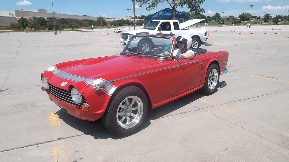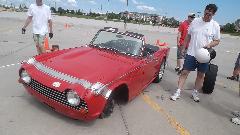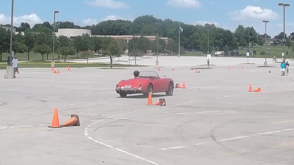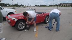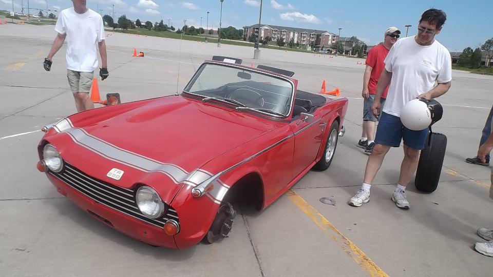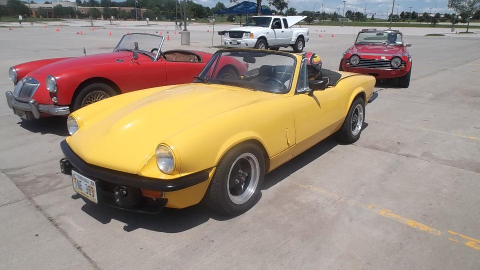 Flatwater Austin Healey Club - Autocross at Southwest High School, Lincoln, Nebraska. Web site said 9:00 am. Apparently that was for set up time, so we had some time to spare. Quick trip to nearby gas station to add a bit of air pressure to front tires. Check and add a quart of oil. Needing to disconnect the trailer, this was a good opportunity to replace the trailer connector. With the car emptied, registered and tech'd, and a couple of walks around the course, borrow a helmet, and it was time to rumble.