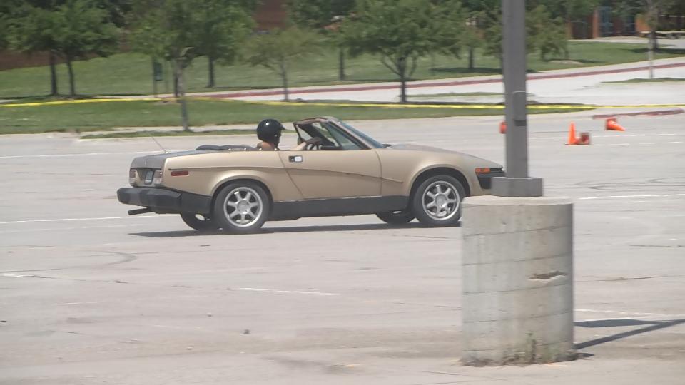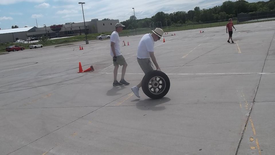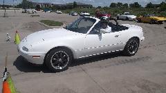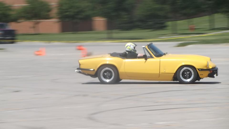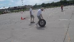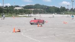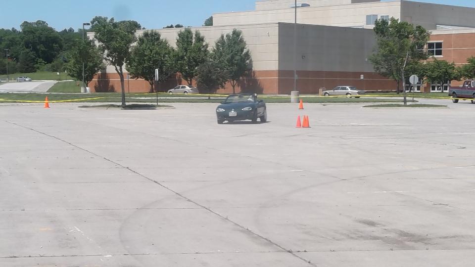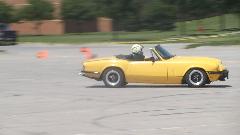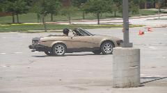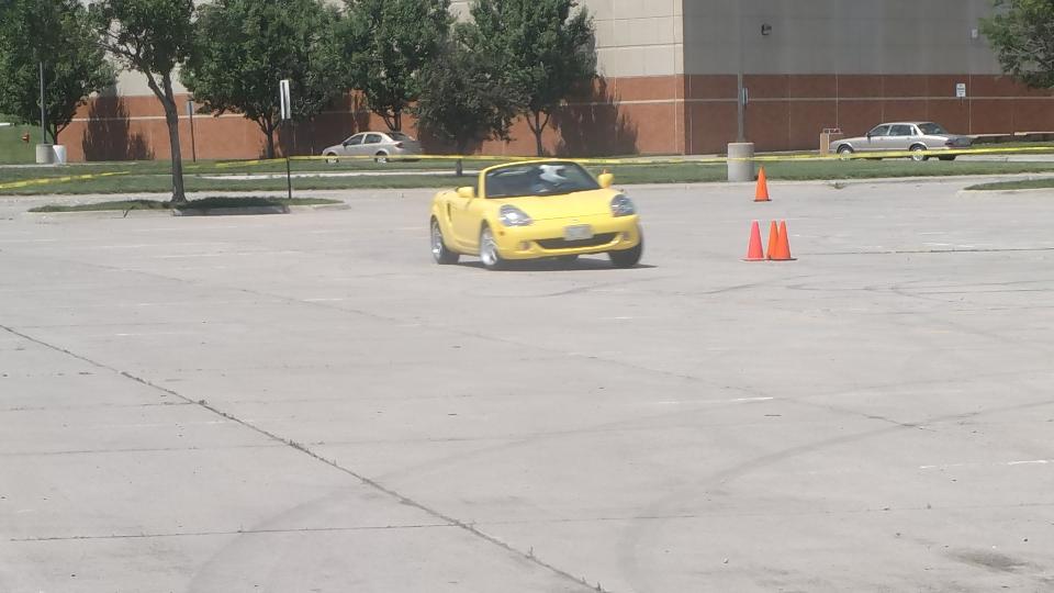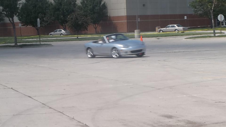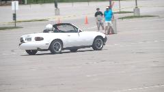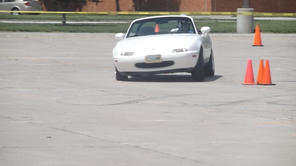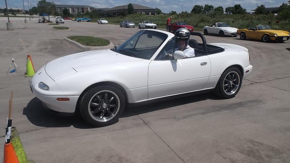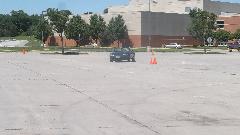 Flatwater Austin Healey Club - Autocross at Southwest High School, Lincoln, Nebraska. Web site said 9:00 am. Apparently that was for set up time, so we had some time to spare. Quick trip to nearby gas station to add a bit of air pressure to front tires. Check and add a quart of oil. Needing to disconnect the trailer, this was a good opportunity to replace the trailer connector. With the car emptied, registered and tech'd, and a couple of walks around the course, borrow a helmet, and it was time to rumble.