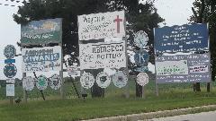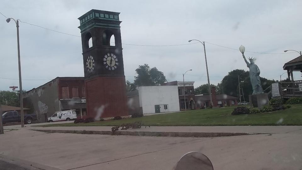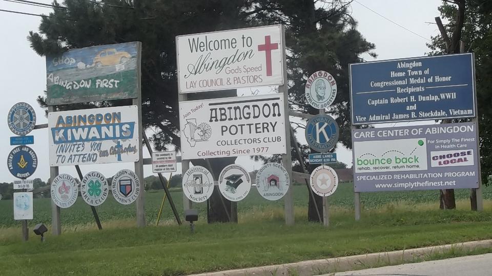 Passing through Abingdon, Illinois (founded by people from Abingdon, England), an amazing collection of welcome signs for a town of 3300 people. Some small business on the main highway, and a two block detour to the older business district.