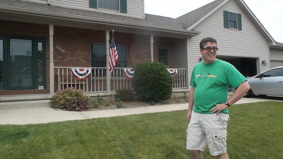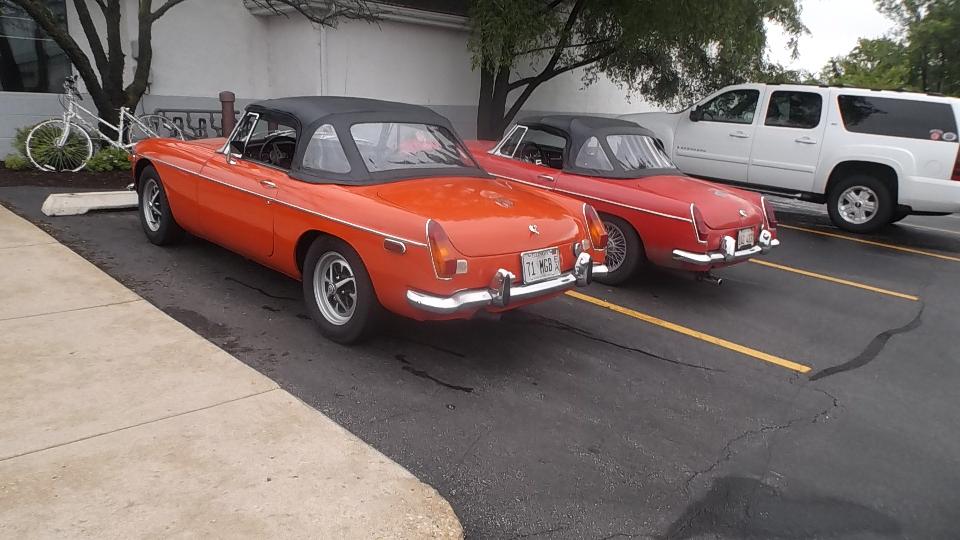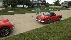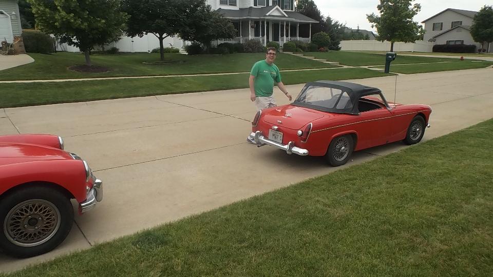After looping past Galesburg, a bit farther north along US-82 near Cambridge, we passed these large electrical generating windmills, which are becoming more plentiful every year in the mid west. In early afternoon we arrive in Geneseo, Illinois and say hello to Scott Johnson. He has an MG Midget, but it was on the road with his son when we arrived.