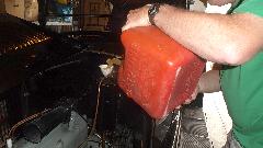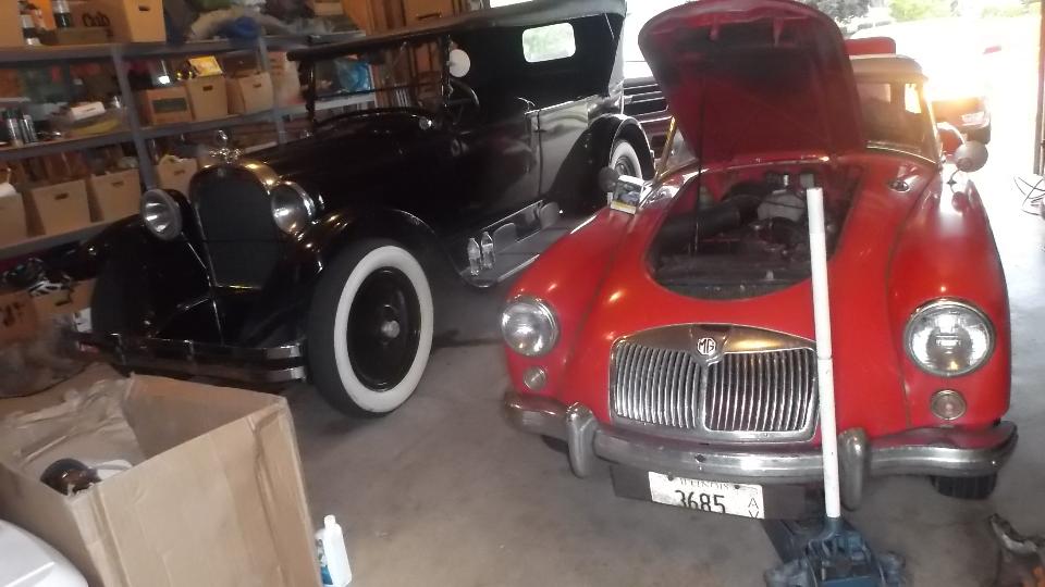Meanwhile the Midget returned, and it had been running rather rough (very rich), so we took the opportunity to tinker with the carburetor adjustments. That done, it was time for another oil change for the MGA (something like the 11th time in 46,000 miles). Then put away the toys for the evening as it was time for dinner and chat.