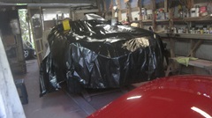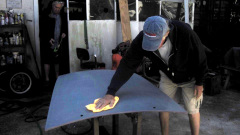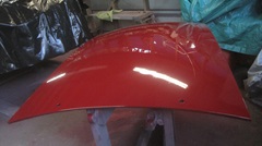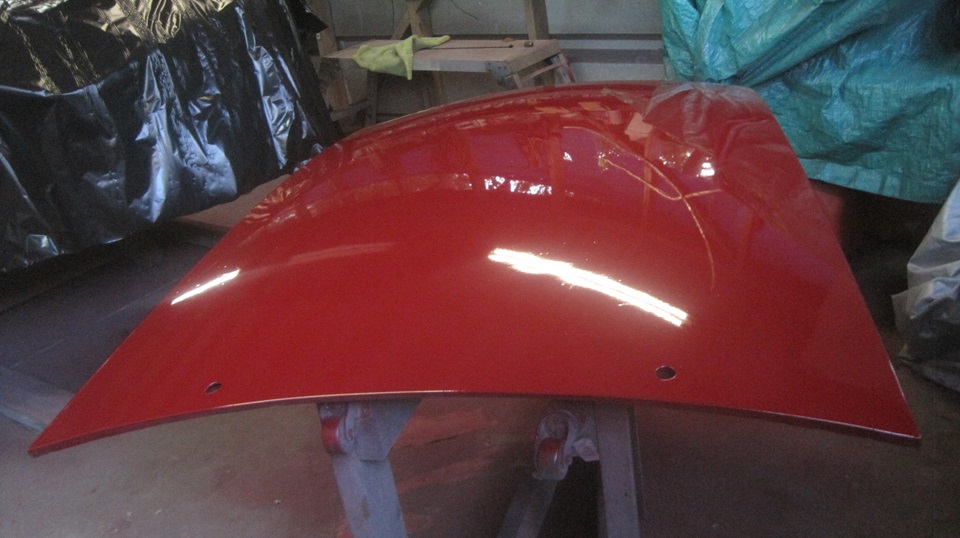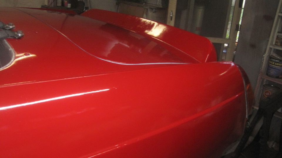 The fiberglass duck-tail spoiler is finish fitted to the boot lid for the Wanna-B race car, so that panel got its final coat of paint.