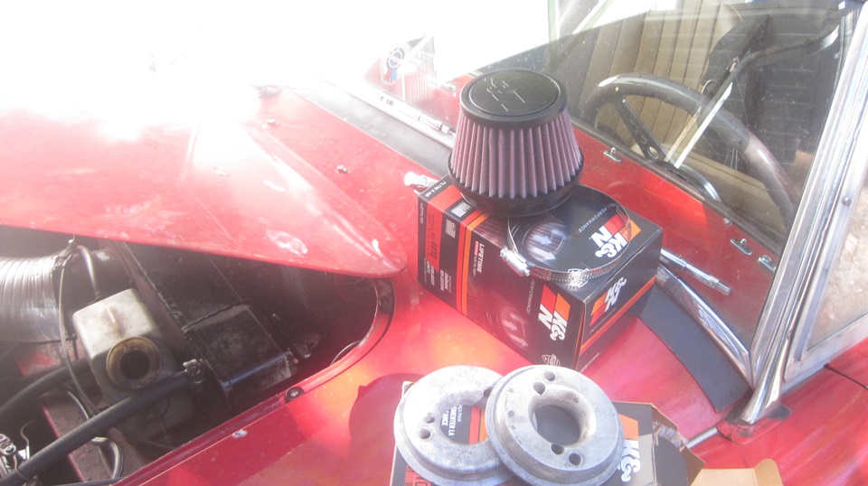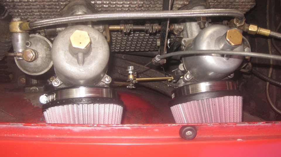 Remove the original (PITA) Volks air cleaners from the MGA for the last time ever, I hope. Get some longer bolts with lock washers and hex nuts to attach the new filter adapter plates to the carburetors (with new paper gaskets). Install the new air filters with band clamps that were included. It's that easy. And now the air cleaners can be removed or re-installed in about ten seconds. I am absolutely ecstatic about this improvement. Posting more pictures.