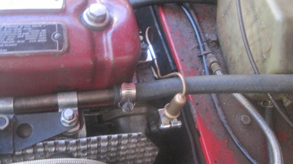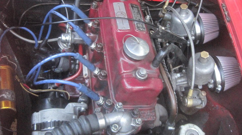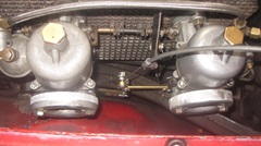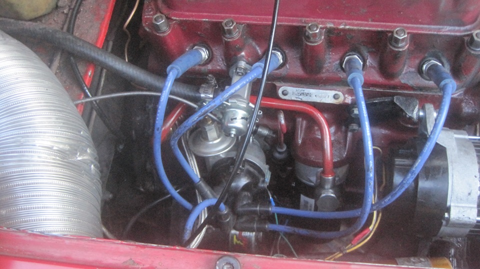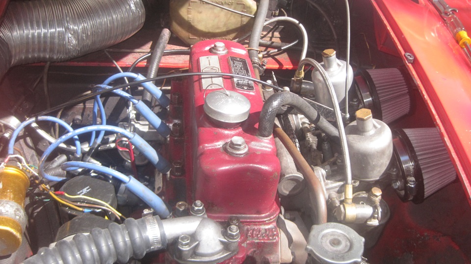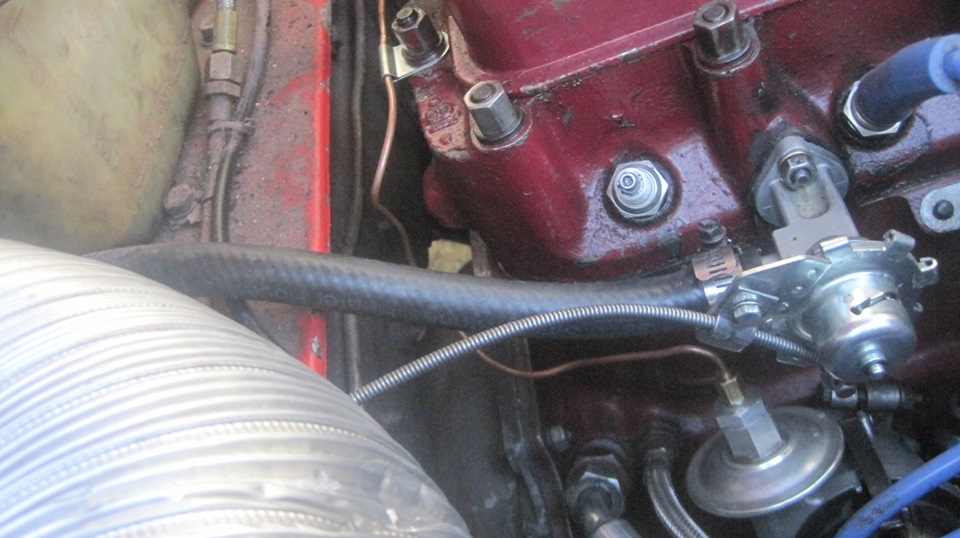 I cheated on the last pictures above. The vent hose from the rocker cover is now hanging with an open end in free air. There is no way to connect it to the front air cleaner. So there are now two open vents from the crankcase, resulting in stagnant gasses inside the engine, no crankcase ventilation, very bad. The best solution for this would be to add a PCV valve to the intake manifold connecting to the front tappet cover to assure Positive Crankcase Ventilation, and also create low level vacuum in the crankcase to reduce or eliminate oil leaking. That's the next modification on the wish list.