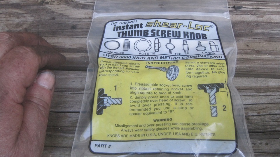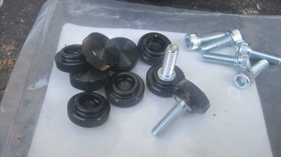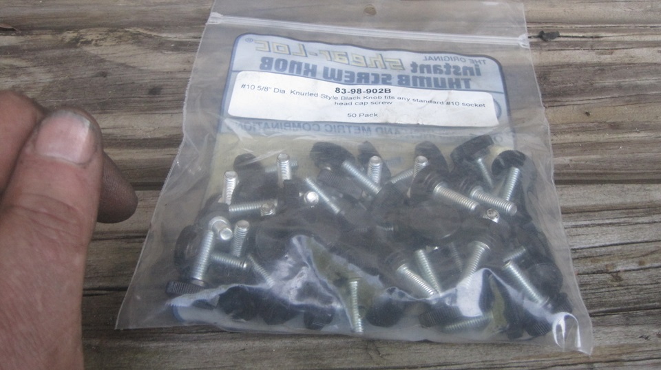 Crack open two small packages from McMaster-Carr containing some #10-32x5/8 Socket Head Cap Screws, and plastic knurled thumb screw knobs, 50 of each. Put a screw and a knob together and pinch it with the bench vice. End Result is a #10-32-UNF x 5/8 " thumb screw that we like to use to attach the MGA bonnet and boot lid for easy quick change. Half hour later we have a package of 50 thumb screws, enough to attach eight panels (6 screws each). Being a small package, toss it into the Magic Trailer for future reference. We like to give these to friends who have two boot lids, with and without luggage rack.