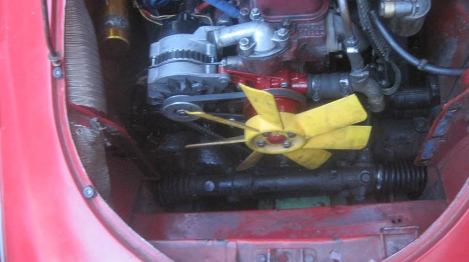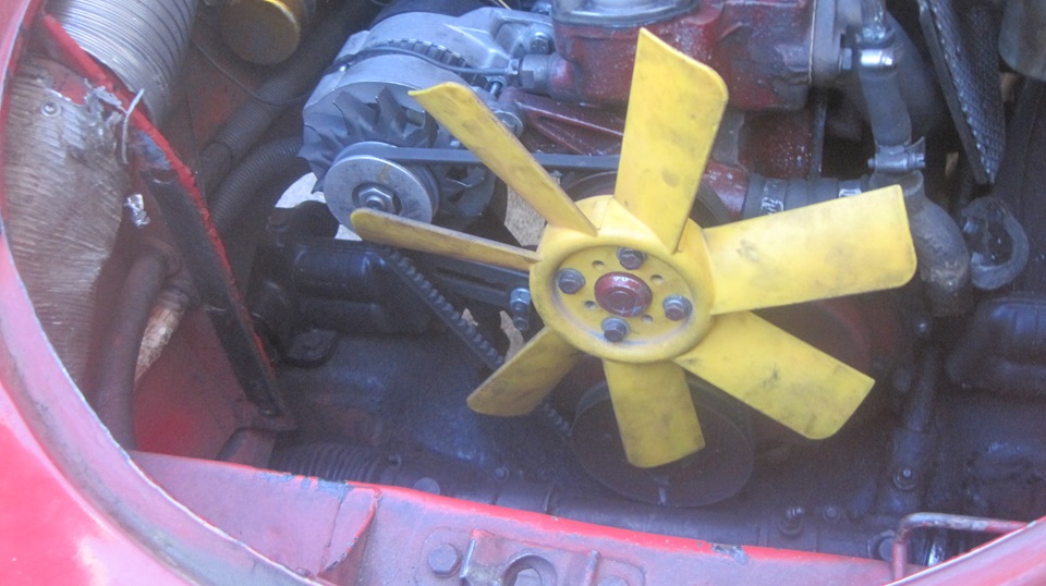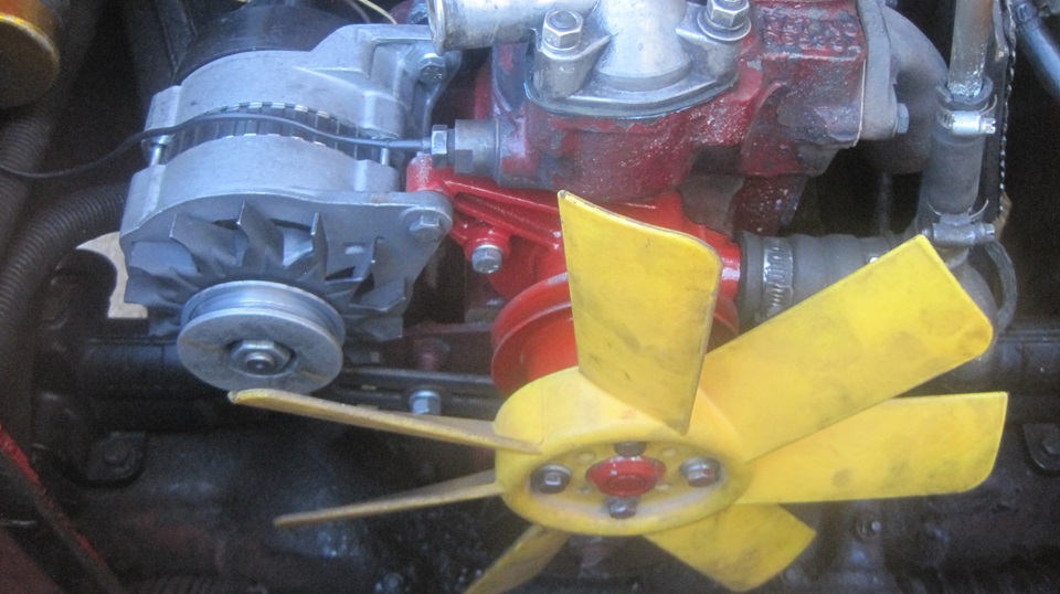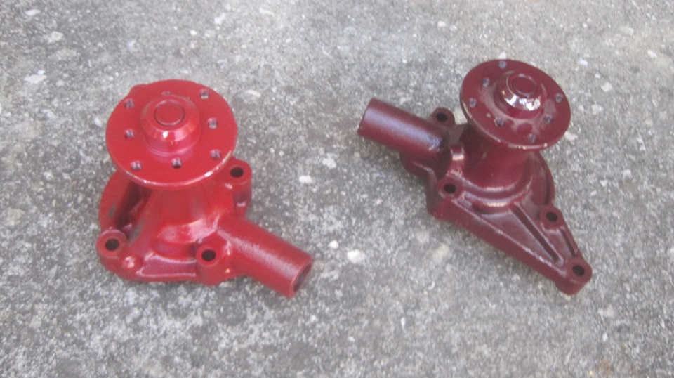 that is as original, or may be an irregularity of the modern replacement water pump. Not too long to find longer bolts, and the B pump was installed in short order along with the supply hose, freshly painted pulley and the nice plastic fan. Before reinstalling the radiator it was a good opportunity to reinstall the fan belt and snug up the alternator.
