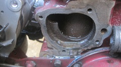 Remove fan and pulley, disconnect pump supply hose, and remove the MGA water pump and expose the slightly larger aperture in the MGB block. You might recall the JB-Weld patch/plug at bottom of the cavity that was needed in early December to make the A pump work in the B block. At the time one dowel pin was pulled out and one was cut off flush when it couldn't be pulled. Now I can reinstall the one dowel pin at bottom of the aperture before installing the B pump.