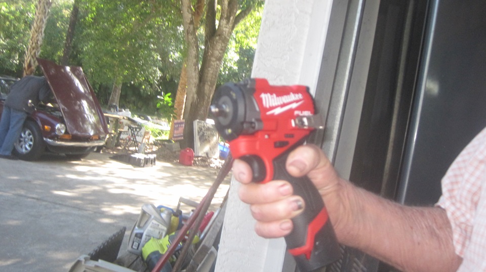 One last hurrah, Jerry has a new tool, a Milwaukee battery powered impact wrench. You wouldn't believe the specs for this little thing, 600 lb-ft torque for tightening, and 1000 lb-ft torque for loosening stubborn fasteners. I think he might have in mind to use this on the motor home wheels. Oh, the battery for this thing is barely larger tan a D-cell, fits in the butt end of the handle.