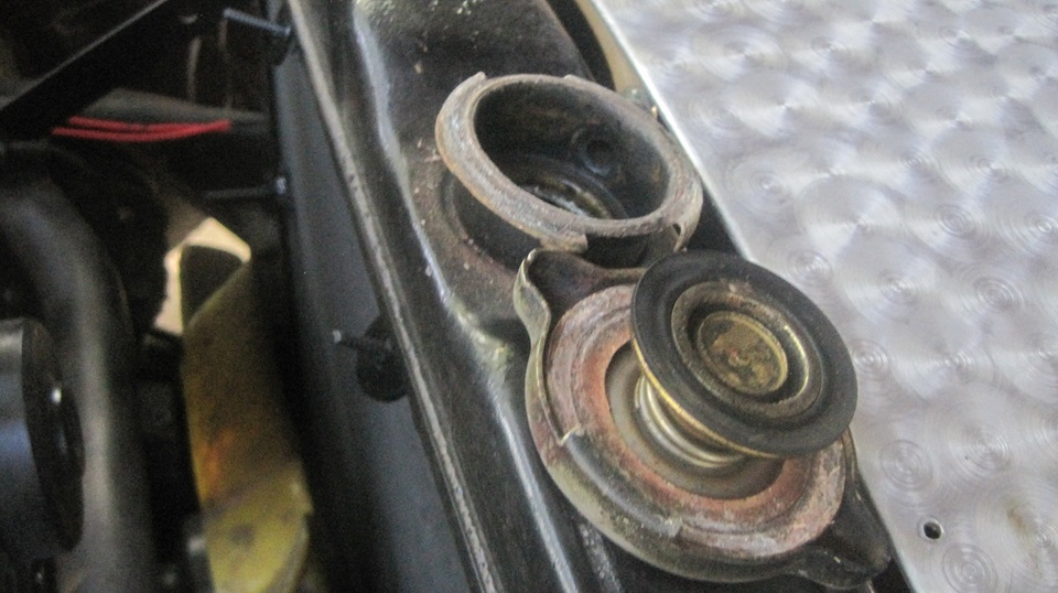 Since this will be our last chance to hang with the guys at Tech Central, we conceded to stay one more day before leaving town. Wouldn't you know, that TR6 that hs been getting so much attention lately has another problem, but it looks oddly familiar. The car has a coolant recovery bottle, but it loses coolant anyway. It didn't take me long to find the incorrect type pf pressure cap, and a very corroded cap to boot. This one has no rubber seal at the top flange, so it could not draw a vacuum to pull fluid back into the radiator from the recovery bottle. Just yesterday I received some recovery type pressure caps for the MGA, but they are long neck variety so will not work for the short neck TR6 radiator. Fortunately the short neck recovery caps are very common, pick one up at any local parts store.