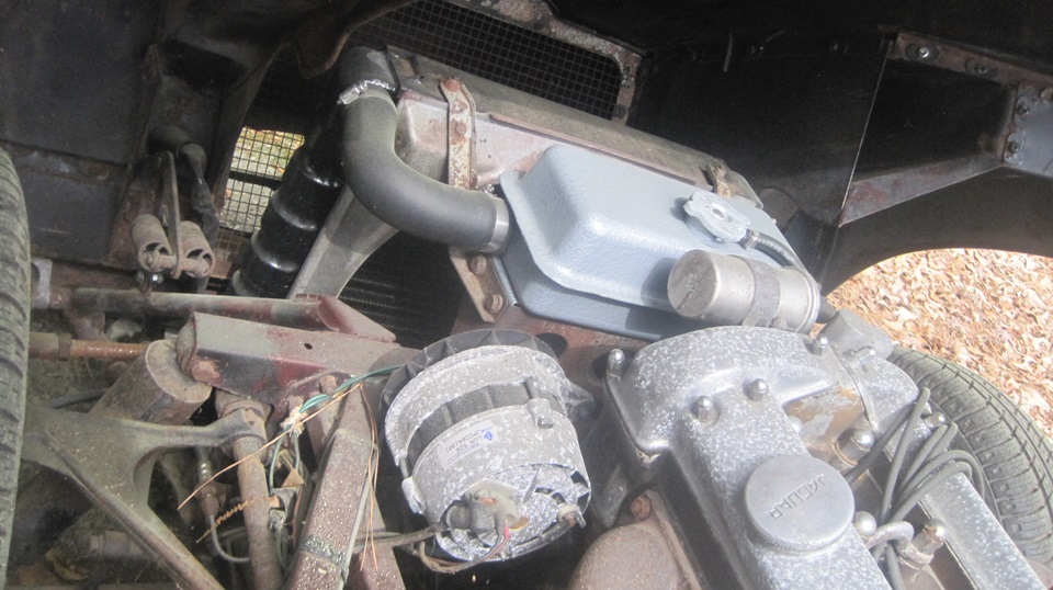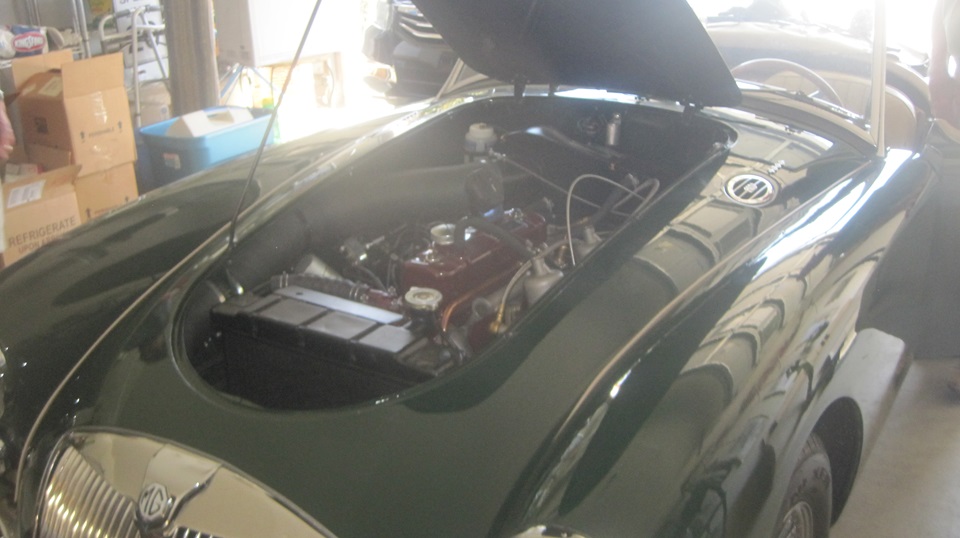 Back to Dave Daniel's MGA by mid afternoon. He was picking up a new Group 26R battery this morning, so we installed that in short order. -- Then on to jacking up the front end to drain the radiator, remove hoses, unbolt and lean it forward a bit. Remove and reverse the misoriented cooling fan, and put it back together. Suppose we got a few skilled knuckles in the process, but no damage to the radiator. Put the coolant back in and pressure test it. it.Time for a test run, once around the block before dusk. -- He still has a pair of accessory aluminum threshold plates to install, but not today.
