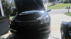 Swapping in new good quality rebound straps on the rear axle. Car on jack stands, lying on back underneath for a hour or so with hard to reach upper stud nuts. Eventually persistence pays, and we got lucky when the nuts came loose so we didn't break any of the studs. Make plans to buy a new battery. Pull a new battery hold down clamp out of the Magic Trailer. -- Nice chat time before calling it a night. Got past some WiFi issues, and finally got my trailer license sticker renewed (should arrive at home address in Illinois in in about 10 days.