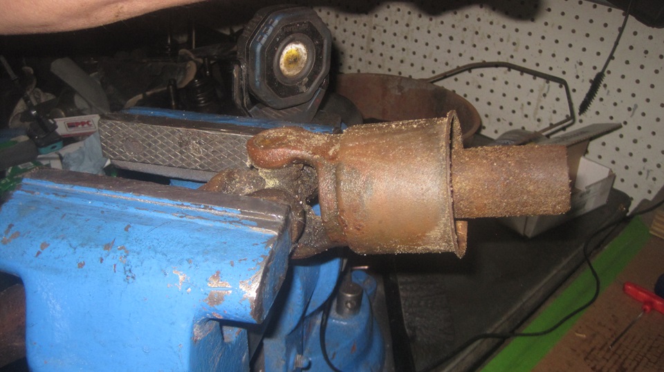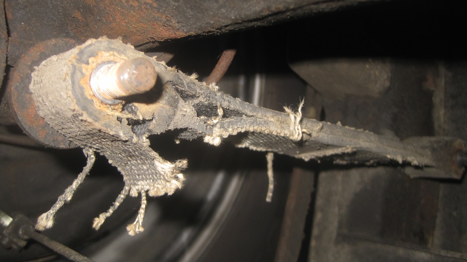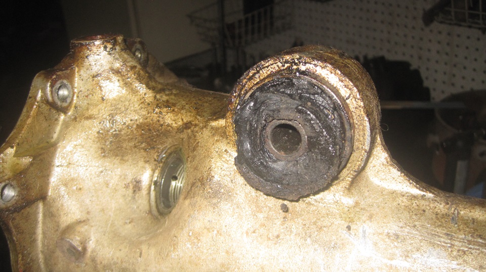 Needing to replace the rear mount. Grab a power drill with 3/8" drill bit to drill out all of the old rubber to remove the center steel tube. Then use a hacksaw to cut through the outer steel tube from the inside, and knock it out. Measure the new bushing carefully. In years past some have been too large on the OD, and others have been too short in length of the center tube.
