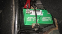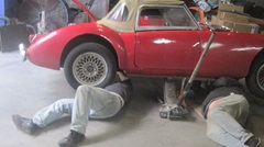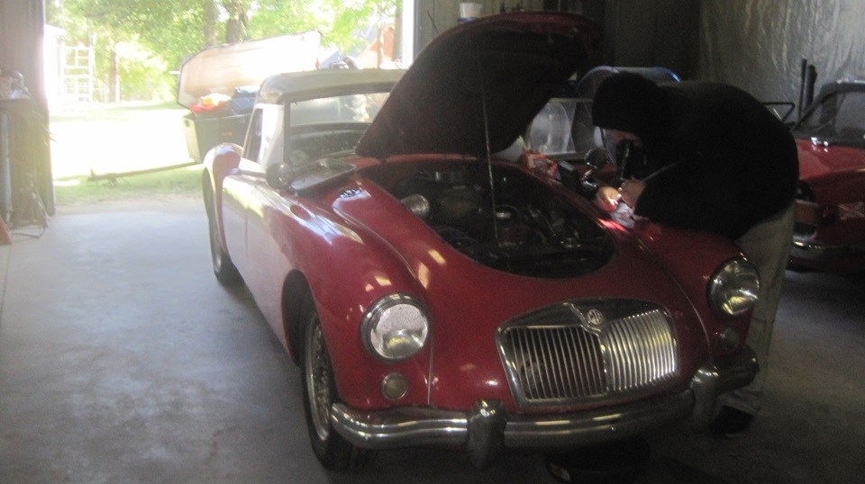 Bit of work on Dave Daniels MGA. No start, trying to use jumpers to charge battery and get it going, no go. Figure out his cheap jumper cables have open circuit at one end clamp, bummer. Set those aside and borrow his neighbor's jumpers for better success. Run battery tests to find dying battery.