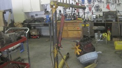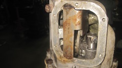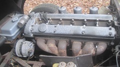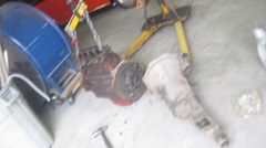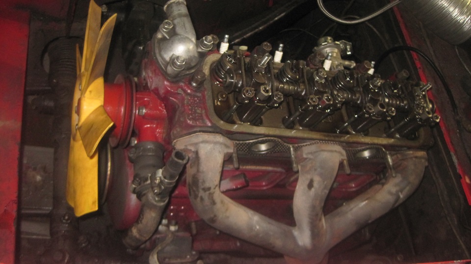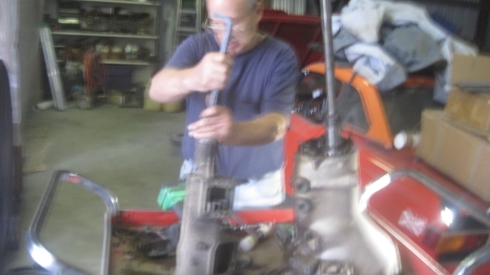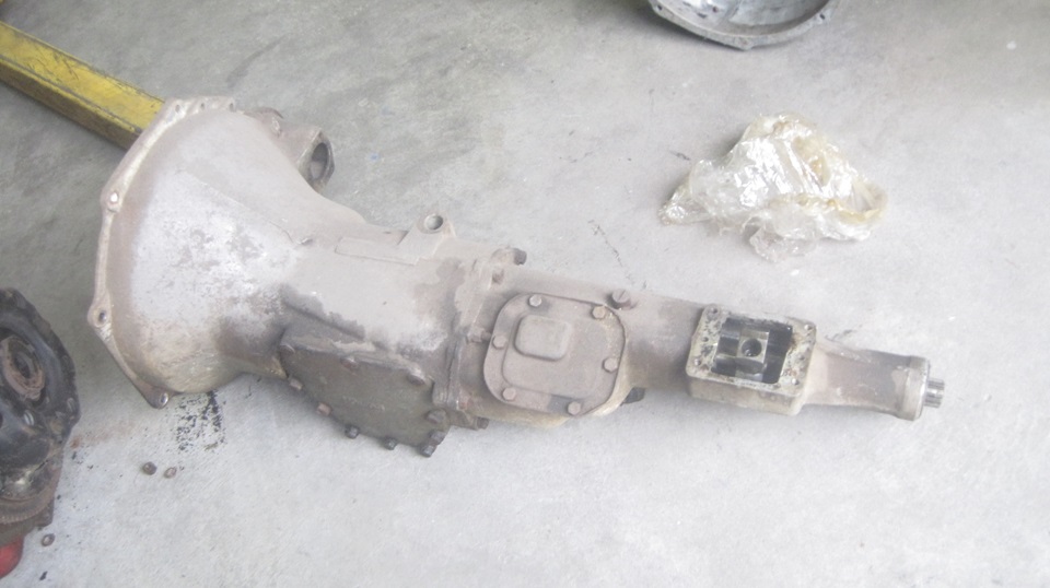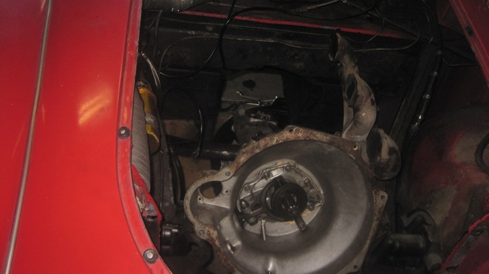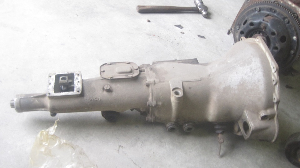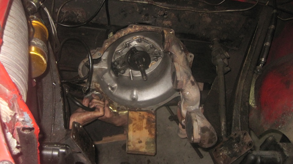 Gearbox swap day from hell? We knew this was going to be a long work day, but it got longer as it progressed. In retrospect, we made a few mistakes, and I think we should have spent another half day with the gearbox before starting to pull the engine. But here we go. Drain coolant, remove radiator, disconnect heater hoses, remove the hanging spin-on oil filter (because it won't clear the engine mount pedestal on the way out). Remove alternator, starter motor , distributor, and disconnect the oil pressure signal hose from engine (bot no oil cooler hoses this time). On the other side, disconnect fuel hoses and control cables, and remove carburetors, intake manifold and draft tube. This is where we (I)made a bad decision for an attempted shortcut. We unbolted the exhaust manifold from the cylinder head, but left it connected to the exhaust pipe, thinking maybe we could sneak the engine out past the exhaust manifold. Bad idea. -- Remove lower bolts from engine mounts, and most of the bellhousing bolts. Attach engine hoist and lift gently, long enough to remove the last bellhousing bolts, then lift engine and pull forward and upward. This is where we got the first slap in the face for the shortcut. The engine rear plate pushed the exhaust manifold up against he steering column just as the sump flange was hitting the engine mount frame pedestal on the other side. But we persisted to force it past, and soon the engine was sitting on the floor out of the way.