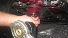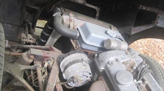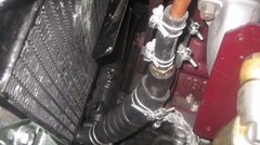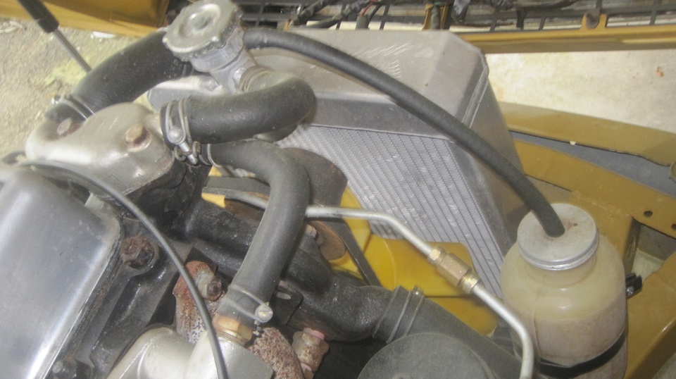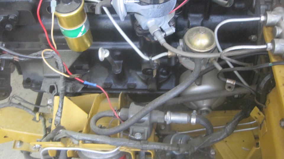 -- Been having an issue with sticky choke on the rear carburetor, so disassemble the choke arm, loosen and re-tighten the jet retaining nut while centering the jet. Nice, but the choke still sticks, so pull out the jet and polish it with oiled fine grit emery paper. Oil the jet and reinstall it, works freely again. Then the mixture nut popped off, having stripped the fine threads in the brass nut. Nothing new, and we did have a new mixture nut in the Magic Trailer, so not long to fix that. Reassemble the choke arm, reinstall the rear carb and the vacuum pipe, front carb, interconnect linkages and air filters. Reinstall alternator and radiator with hoses, reconnect heater hoses, and water valve control cable. Reinstall the temperature sender, and refill coolant (no leaks this time). Feeling better as we get closer to run time. Must be about midnight.