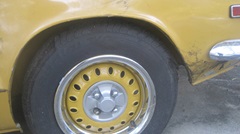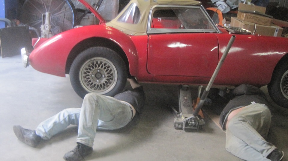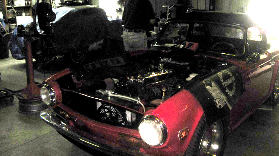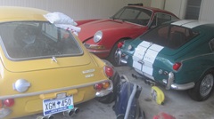 The green car is a TR GT6 with a leaky radiator and likely stale fuel. Considering how to drain the fuel tank. The red one is a Porsche 911, and there were two 912's, maybe slightly neglected (too many toys)? The yellow one is a GT6+ which recently threw a tire tread, , aged out we think. ., Now due for a little body repair and partial repaint, along with a new set of tires of course.