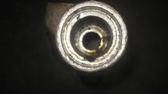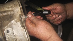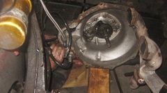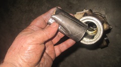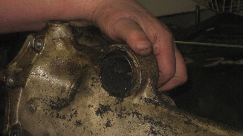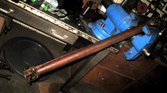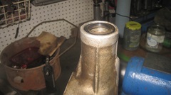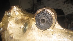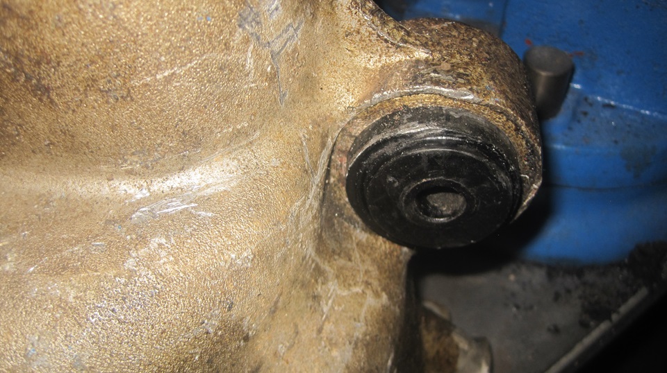 Do not push on the center rubber core. Use a large wrench socket to push on the outer steel shell. I have set the alloy housing on a round tube jack stand for back up while hammering the new bushing into place. Next was to remove the worn bi-metal bushing from the tail end. It is possible to make a special double-D washer to insert behind the bushing, and pull it out with a long screw puller (like the screw from a coil spring compressor). Or you can use a tapered punch with a chisel point to collapse one side of the bushing inward, then pull it out with Vice-Grip on a slide hammer. Another ploy is to use a long 1/2" drive socket extension, grind the wide end flat to have sharp corners, and use it as a punch to drive the bushing out from the inside. This one was particularly stubborn. We ended up using the tapered punch, and the Vice-Grip puller, and the long punch from the inside.