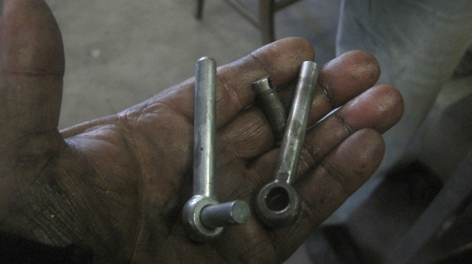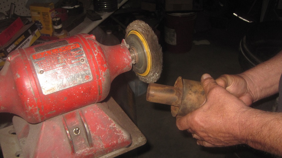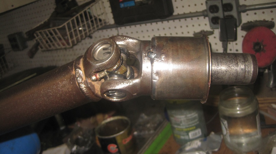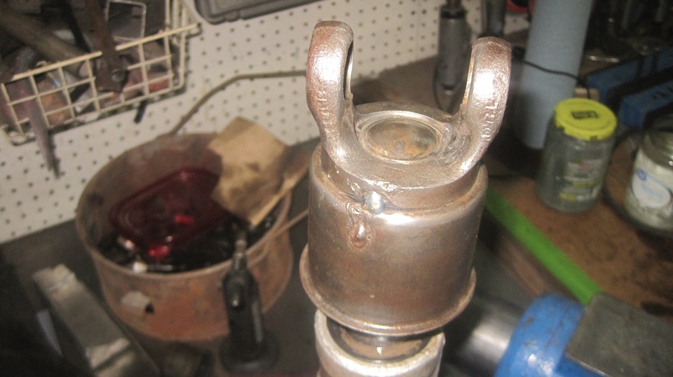 But we will also need a different propshaft. The box currently in my car is early 1500 type, where this one ismid1500 type (different output splines and rear seal). Searching around a bit, we found the matching 2nd style propshaft outside in the mud. A little rusty, but it was cleaning up okay. Needs two U-joints, so we proceeded to disassemble this too. Grind out two small tack welds to remove the dust cup, and polish away at the smooth OD for the journal bearing and seal surface. That came out okay, looking serviceable.